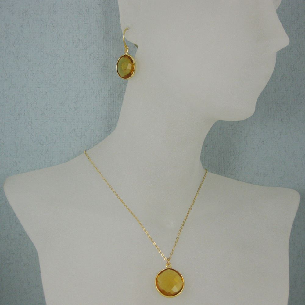 Bezel Gemstone Round Pendant Necklace & Earrings-Gold Plated-Citrine Quartz (16-24")