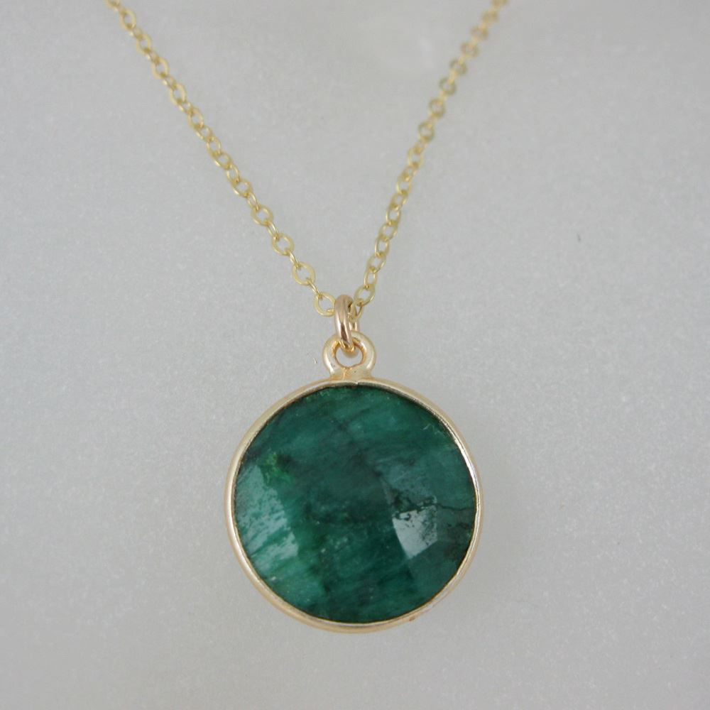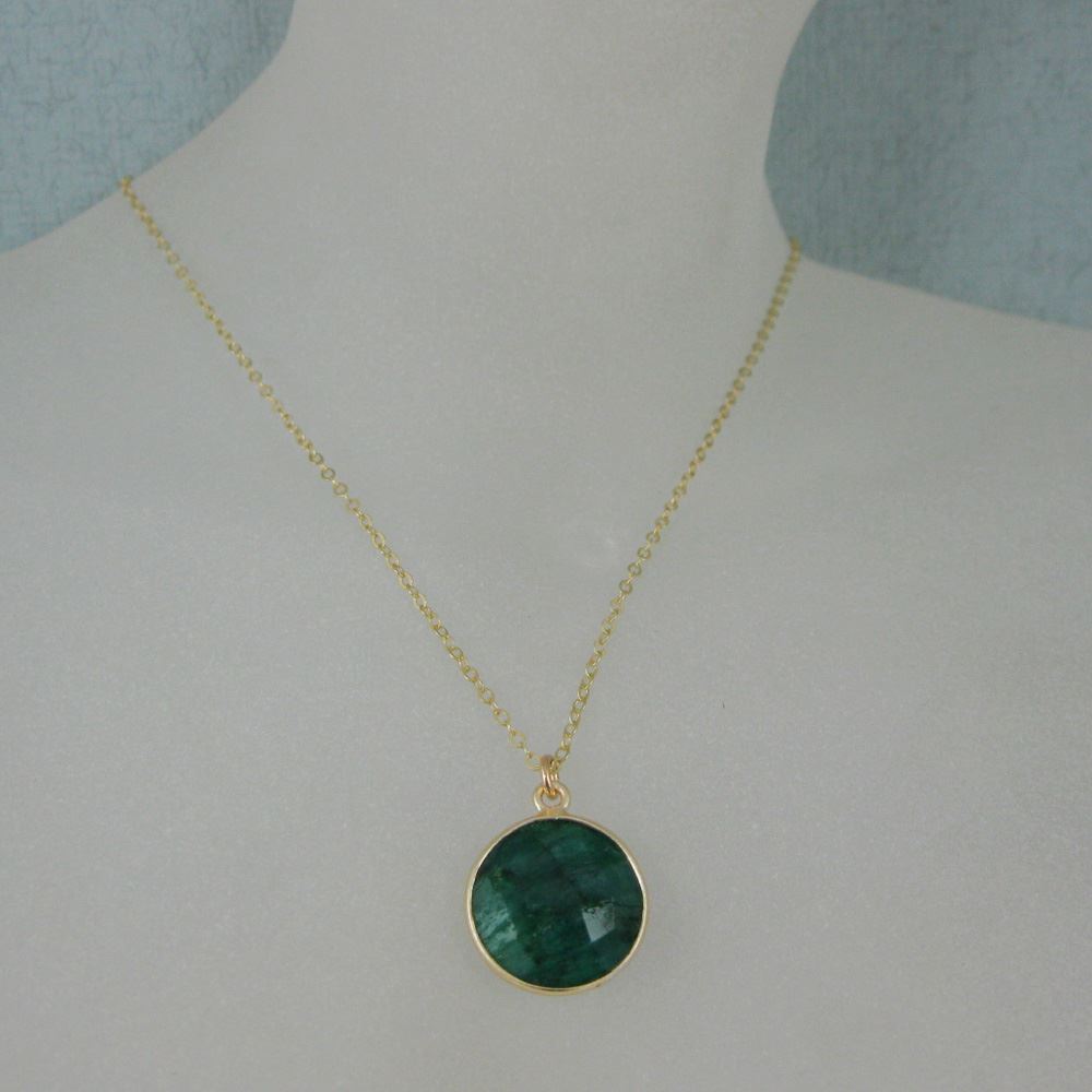 Bezel Gemstone Round Pendant Necklace - Gold Plated Chain - Emerald Dyed (16-24")