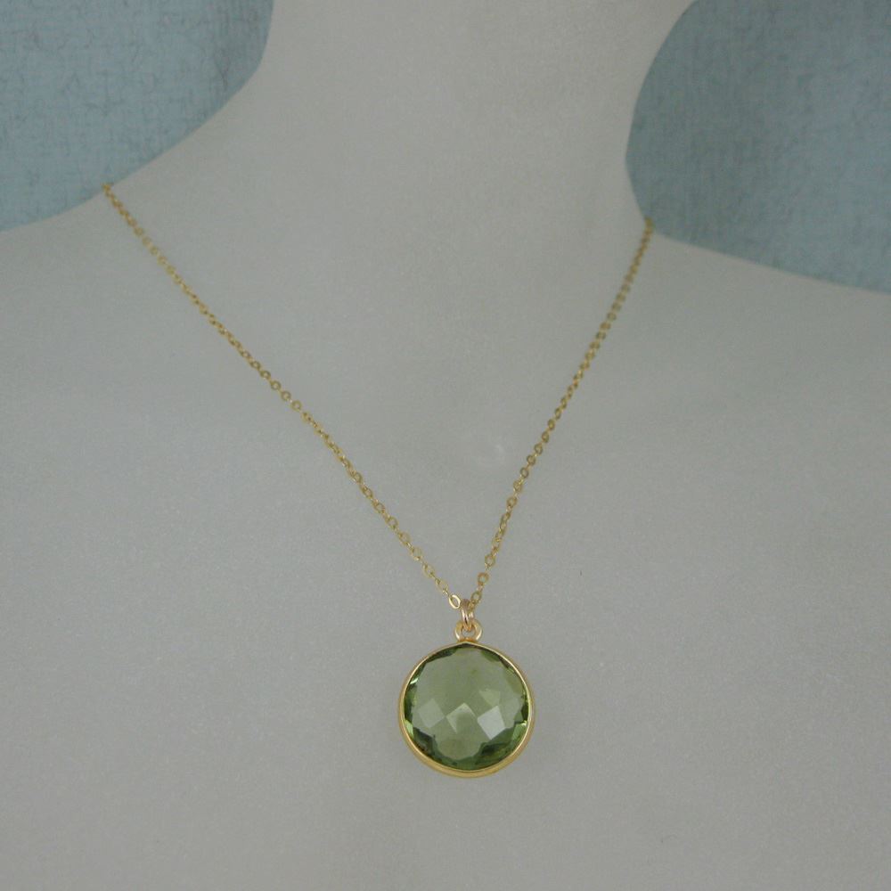 Stone: Green Amethyst QuartzChain and Frame Material: 18K Gold Plated Over Solid Genuine .925 Sterling Silver. Stone Shape: Faceted coin shape on both sides. Pendant Measurement: 19mm long, stone is 14mm. Chain Length: 16 to 24 inches. If you would like a different length please contact the seller