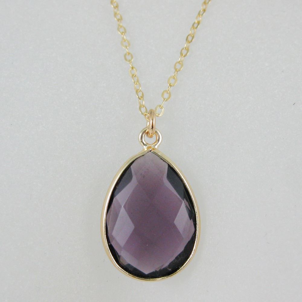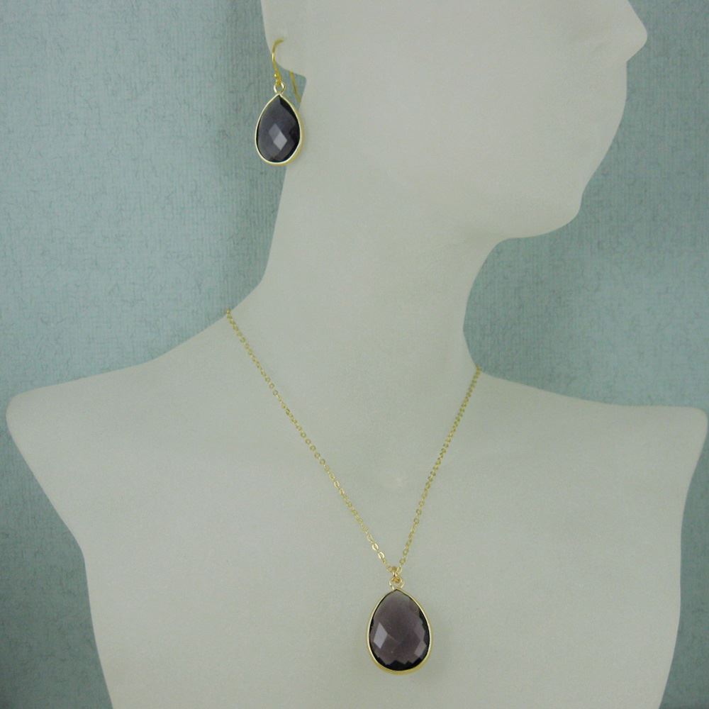 Bezel Gemstone Tear Pendant Necklace & Earrings - Gold Plated - Amethyst (16-24")