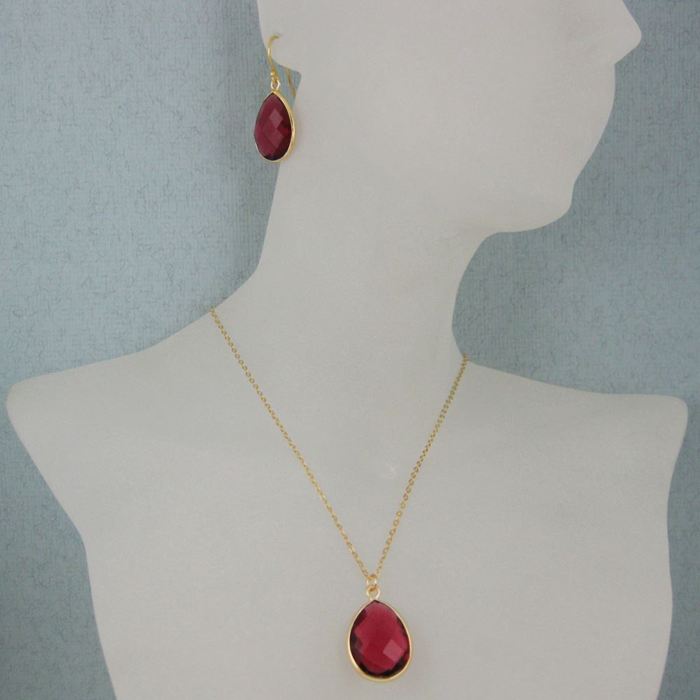 Bezel Gemstone Tear Pendant Necklace & Earrings - Gold Plated - Rubylite Quartz (16-24")