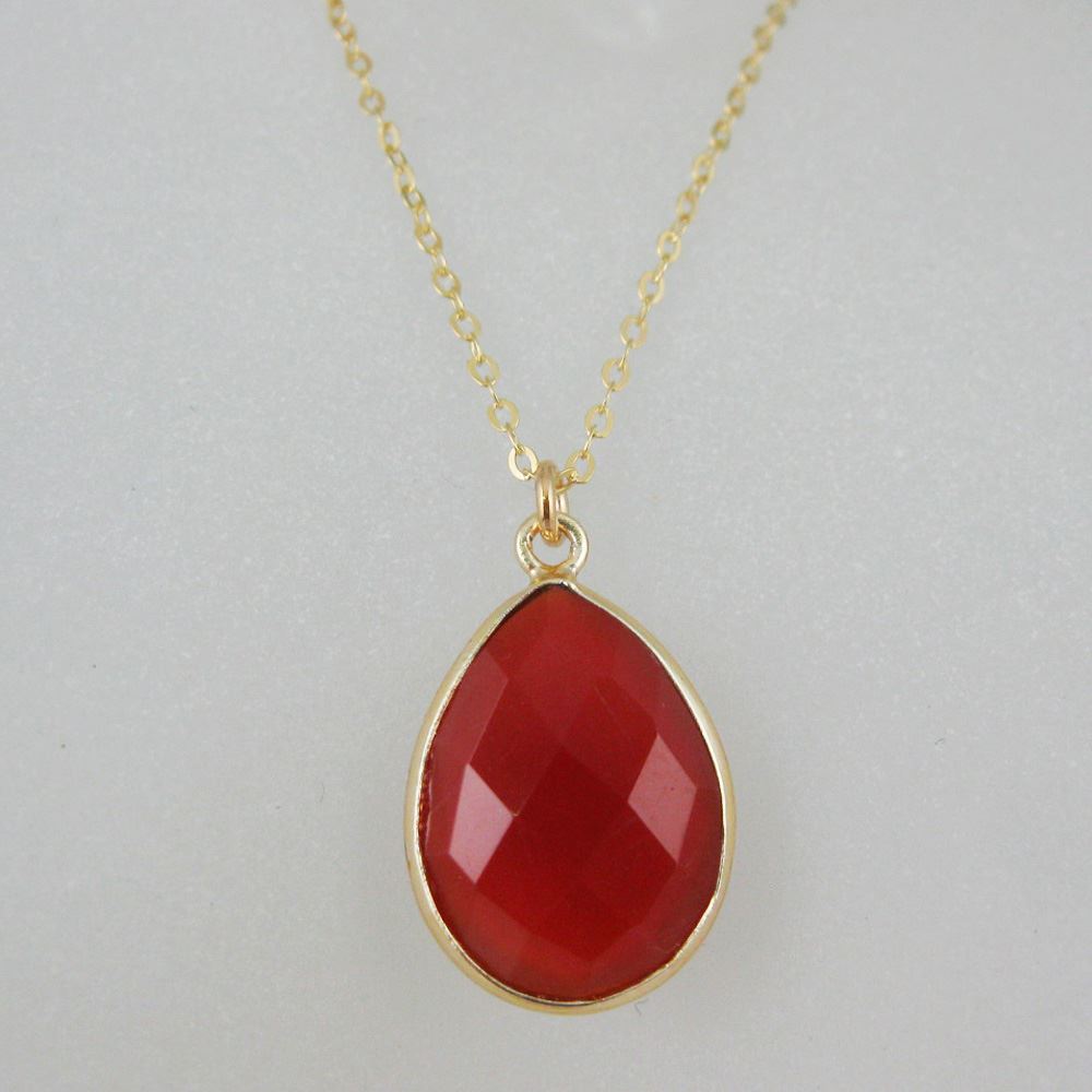 Bezel Gemstone Tear Pendant Necklace - Gold Plated Chain - Carnelian (16 - 24 inch)