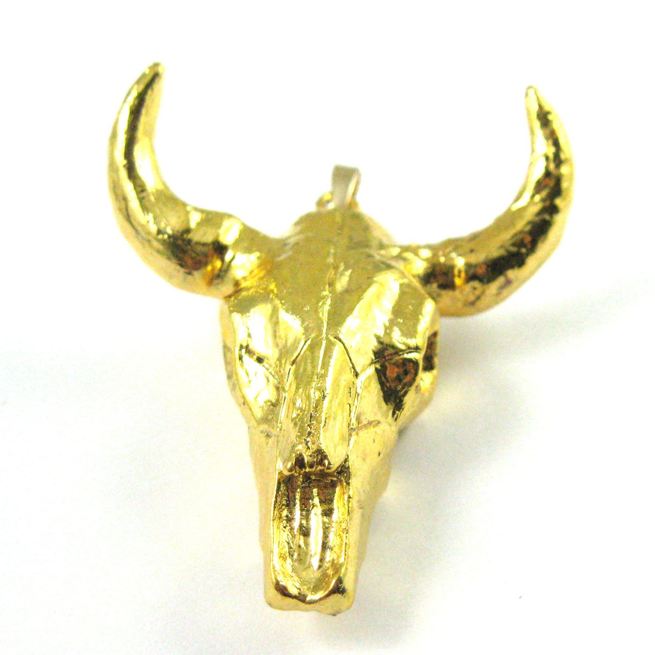 Stone: BoneType: PendantBail: 24K Gold plated brassPendant Material: 24K gold plated boneShape: Bull skull pendant with curved horns, completely gold dippedMeasurement: Approximately 58mm long by 21mm around, 49mm wide hornsWeight: about 14-16 grams per piece.Quantity: 1 pendant