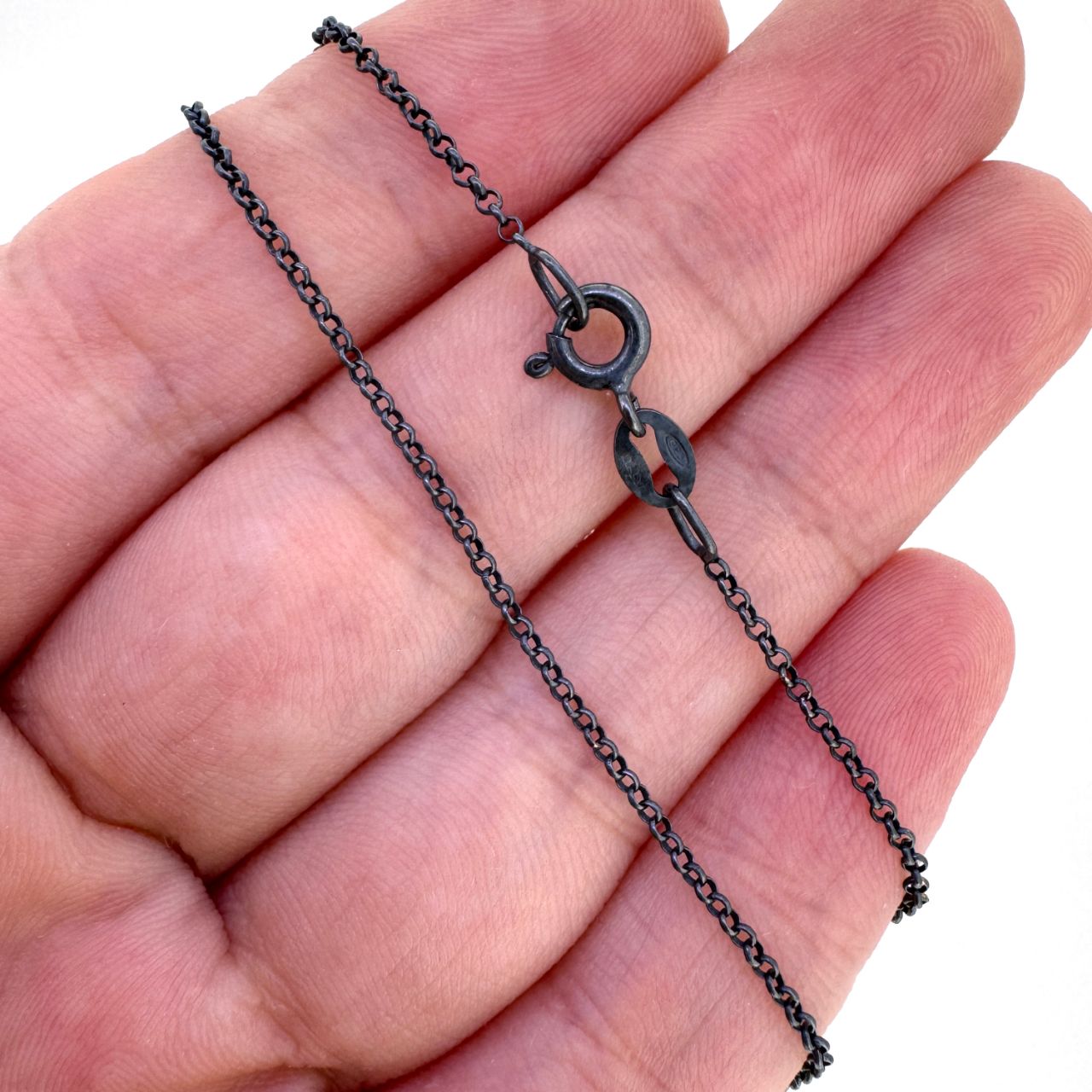 Add to compare list Oxidized Sterling Silver Finished Jewelry Chain - 2mm Rolo Chain SKU : 601005-OX Lengths: 16" - 36", 2mm rolo links Log In for Wholesale Prices