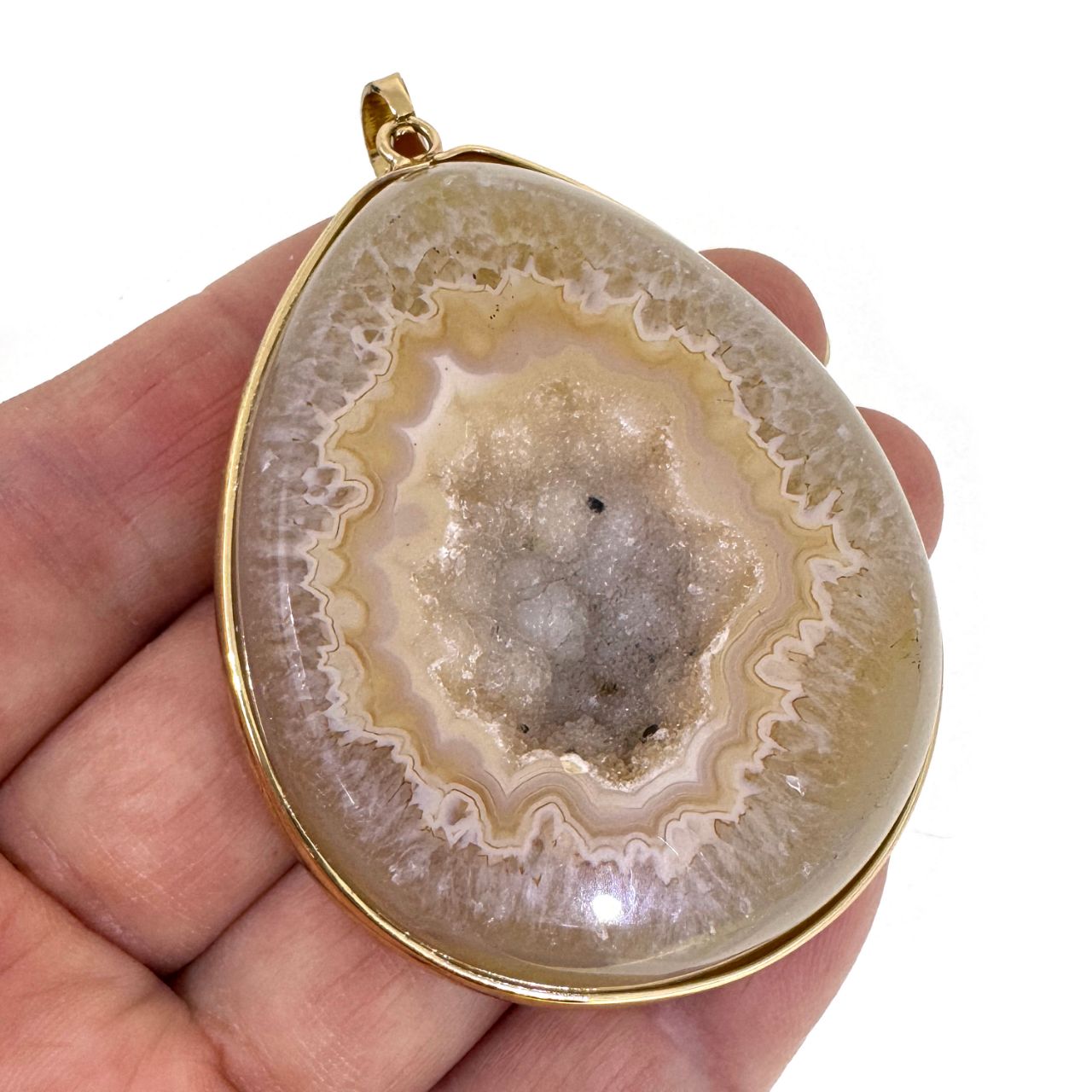 Stone: Natural Druzy AgateType: Huge Druzy Geode pendantBail: Gold plated Brass edging and bail, 8.5mmShape: Organic large teardrop shapeMeasurement: Approximately 52-62 mm by 35-49 mm wide, 8-13 mm thickWeight: 30-40 grams per piece.