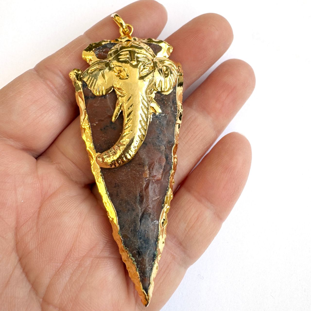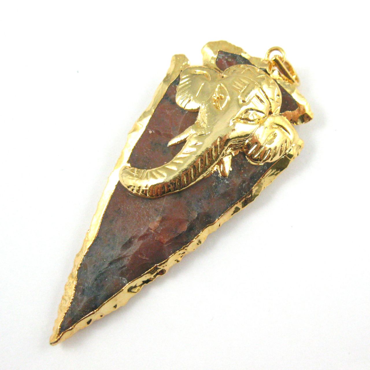 Stone: Nature Agate JasperType: Elephant pendantBail: 24K Gold plated brass, 10mm longPendant Material: Nature Agate Jasper with 24K gold dipped edgesShape: Arrowhead Spear shapeMeasurement: Approximately 76-81mm long ( including bail), 32-37 mm wide, 12-14mm thickWeight: about 22 grams per piece.SKU#: 292216Quantity: 1 pendant