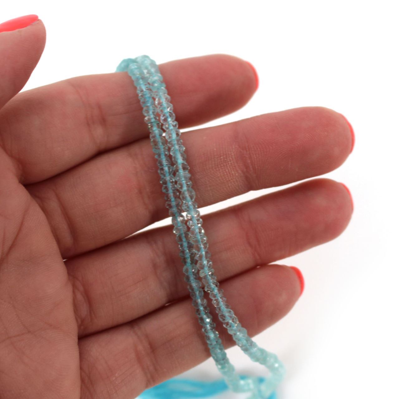 Gemstone Name: AquamarineShape: Hand cut Faceted RondellSize: 3-3.5mmLength: 13 Inch StrandNumber of Beads: About 180 Beads