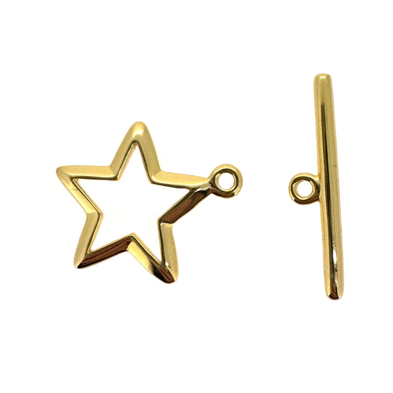 Material: Gold Over Solid Genuine .925 Sterling Silver,with special anti-tarnish plating, the gold color can last for years with normal wearShape: Simple Star shape toggleMeasurement: Bar is 21mm, 1.5mm thickness. Star is approximately 16.7mm with ring - 14mm without, 1.8mm thickness. Rings are 3mm Outer Diameter, 1.3mm Inner.