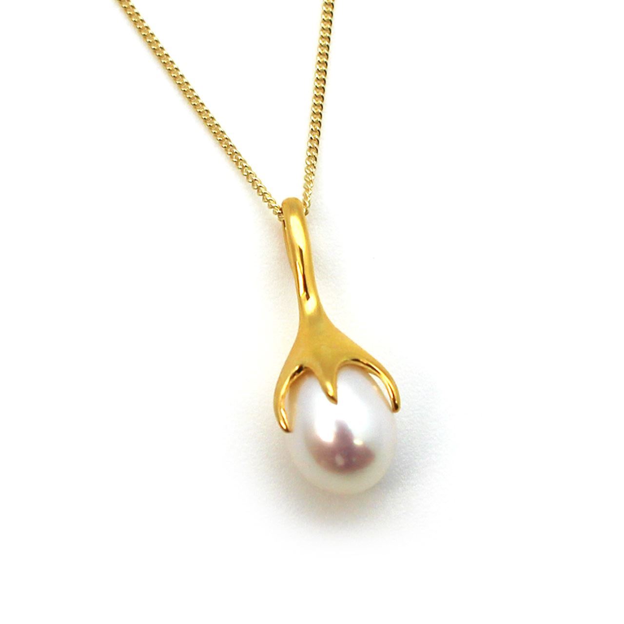 A white freshwater pearl looks ready to bloom out of a shiny gold over sterling silver pendant that lays on a dainty gold over sterling silver chain. This necklace is the perfect accessory for any bridal party or the perfect birthday gift, especially for June birthdays.
