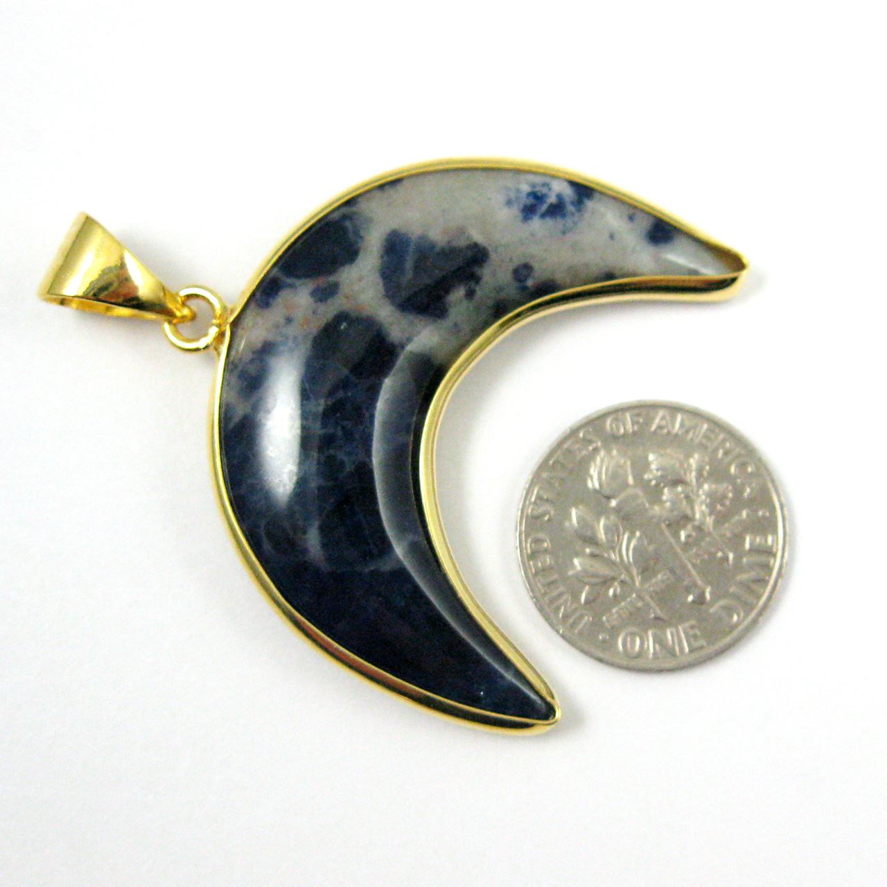 Stone: Natural SodaliteType: PendantBail: 24K Gold plated Brass bail, 10mmShape: Arch pendantMeasurement: Approximately 36mm wide by 34mm long, 6-7mm thickWeight: 7-8 grams per piece.Quantity: 1 pendant