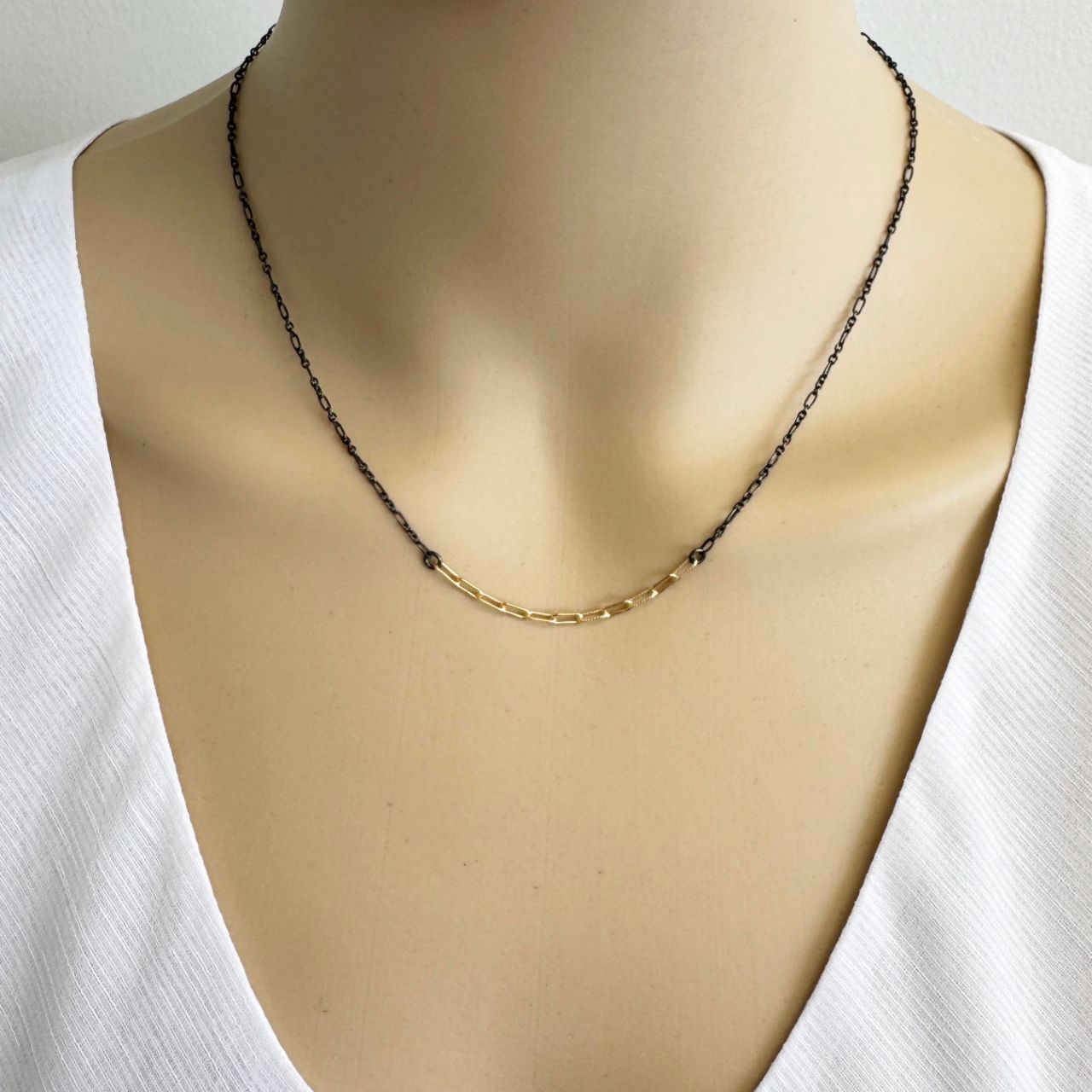 Add to compare list Oxidized 925 Sterling Silver Figaro Chain Necklace with 1/20 14K Gold Filled Magnetic Clasp SKU : N0203X-GF Mixed Metal- Oxidized 925 Sterling Silver and 1/20 14K Gold Filled. 18" in Length. Log In for Wholesale Prices