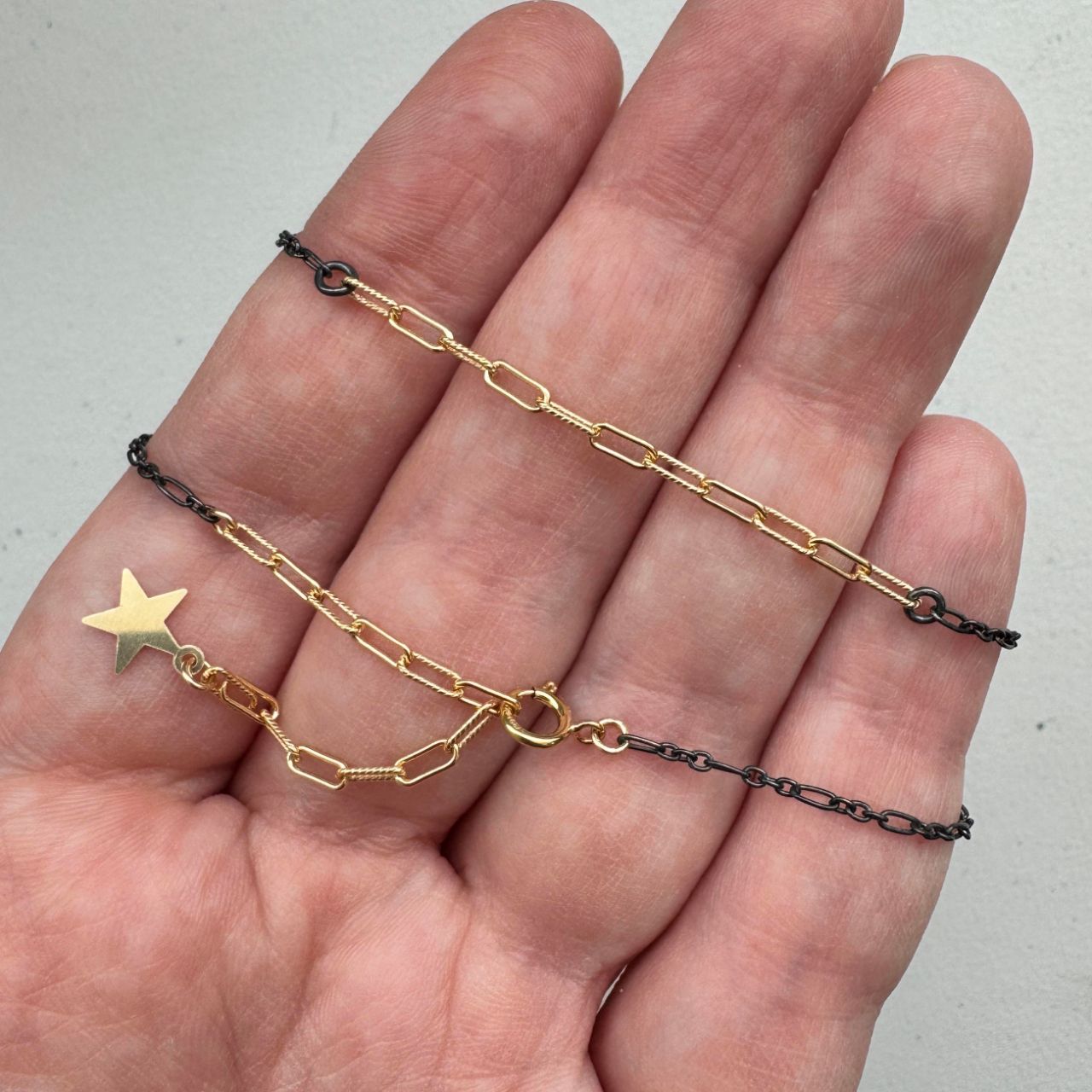 Add to compare list Oxidized 925 Sterling Silver Chunky Rolo Chain Necklace with 1/20 14K Gold Filled Round Toggle SKU : N0205X-GF Mixed Metal- Oxidized 925 Sterling Silver and 1/20 14K Gold Filled. 18" in Length. Log In for Wholesale Prices