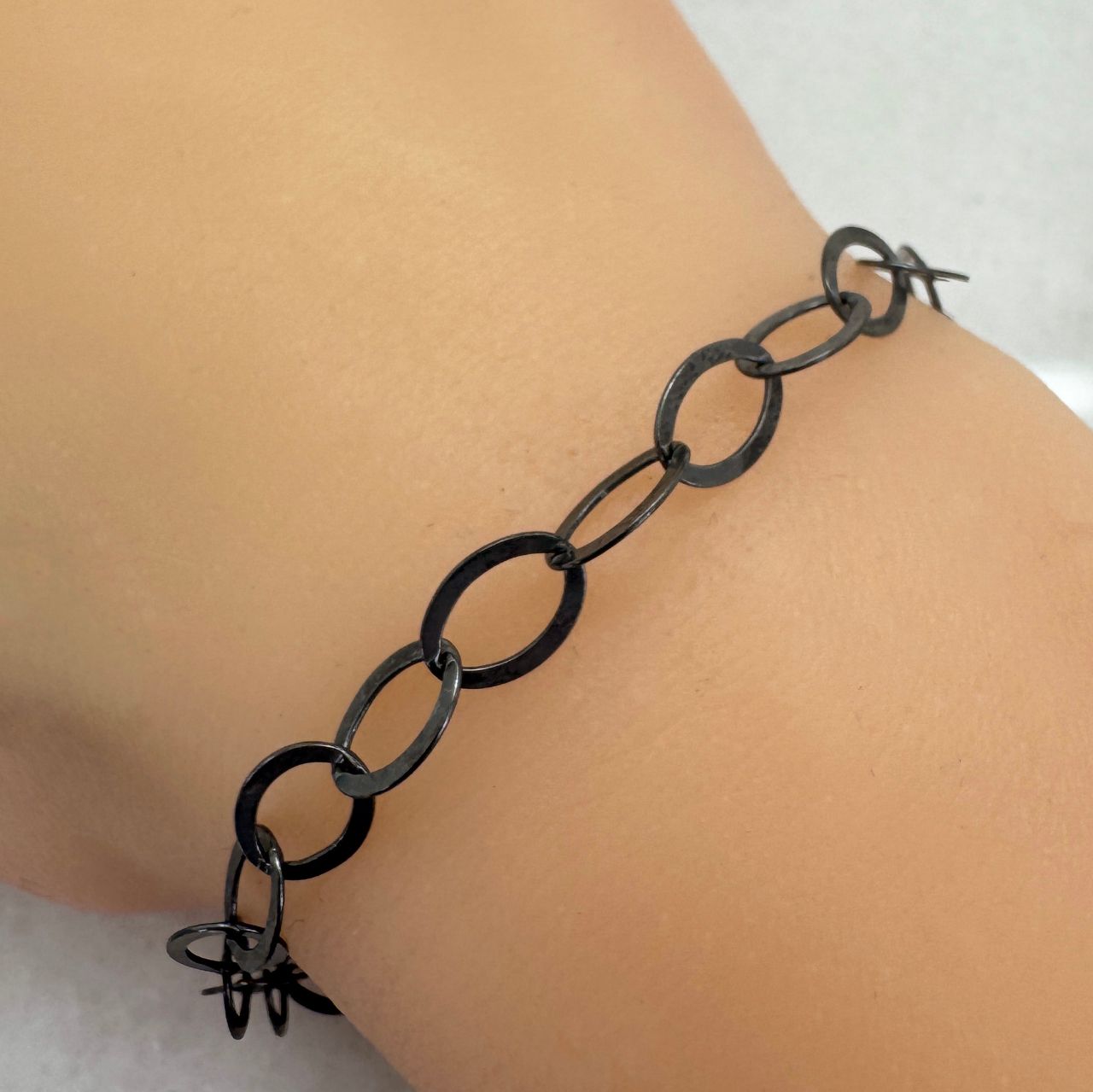 Add to compare list Oxidized 925 Italian Sterling Silver Finished Chain - Flat Cable Oval Chain SKU : 601010OX Shiny Dark Black Color Lengths: 7" - 36" Log In for Wholesale Prices