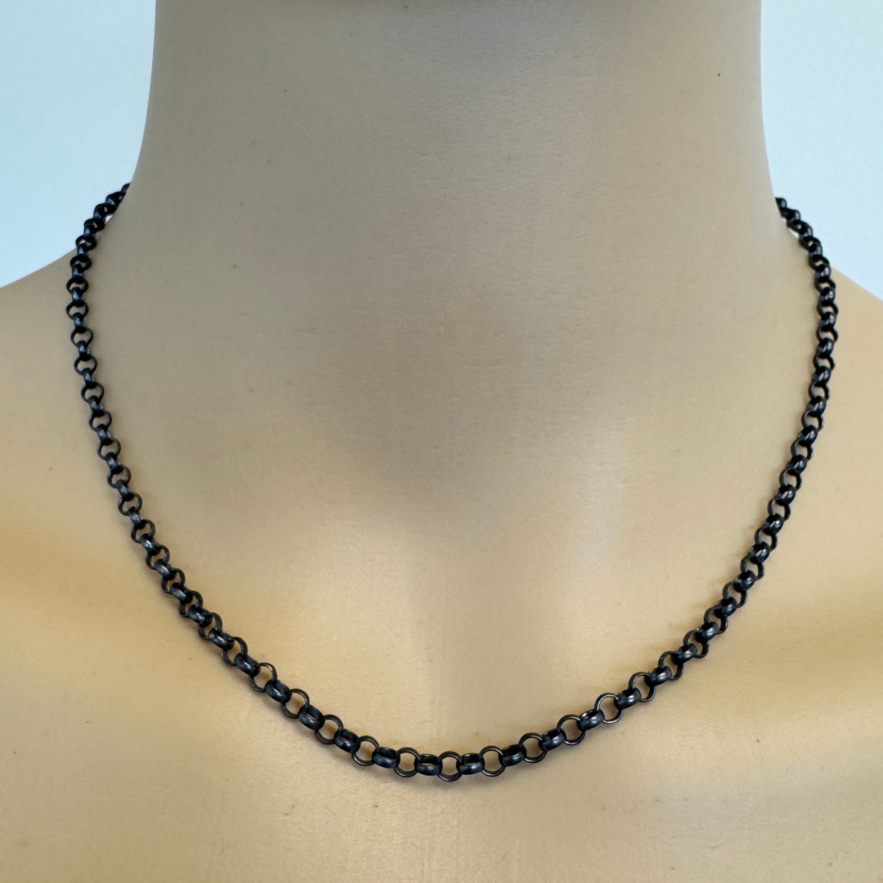 Add to compare list Oxidized Sterling Silver Finished Jewelry Chain - 2mm Rolo Chain SKU : 601005-OX Lengths: 16" - 36", 2mm rolo links Log In for Wholesale Prices