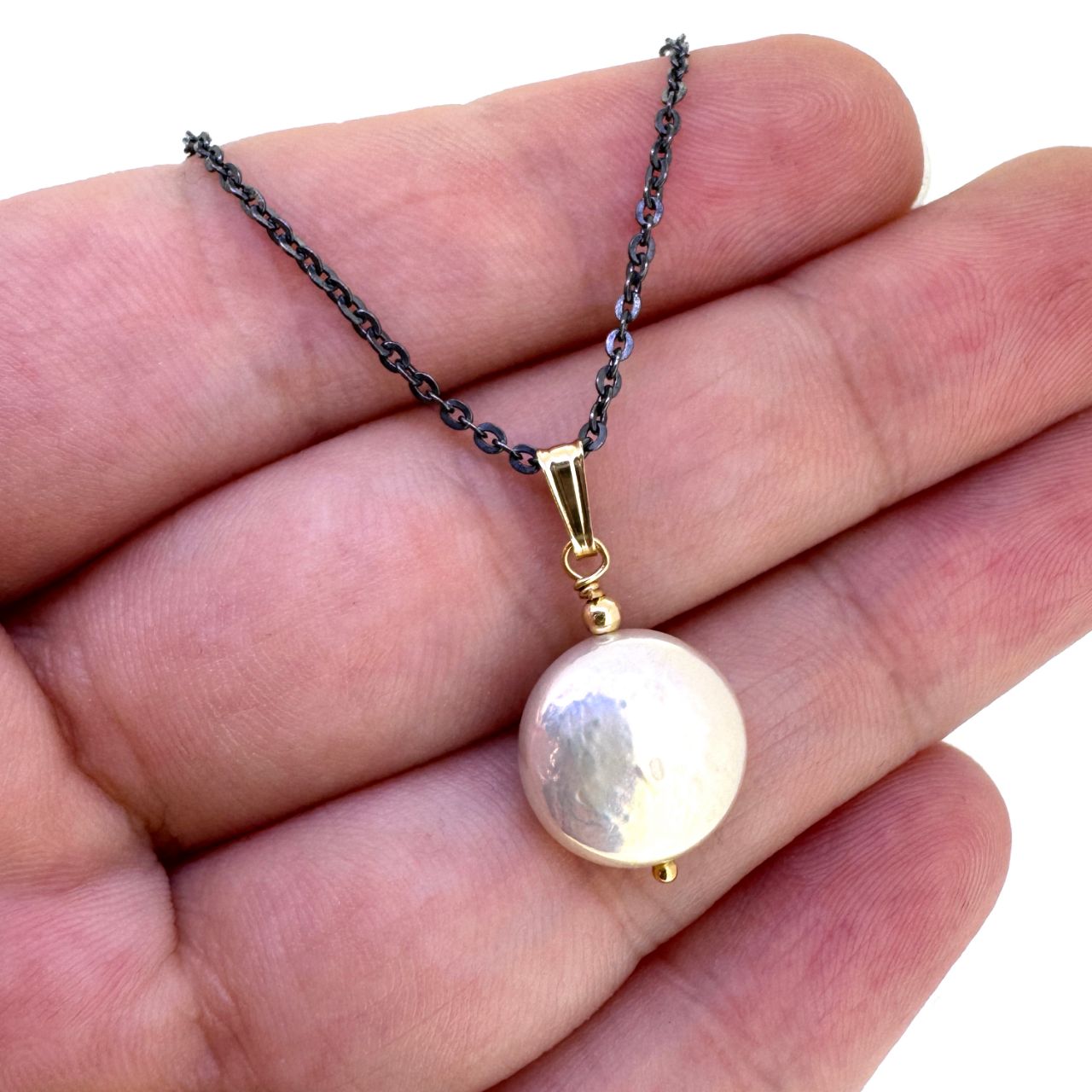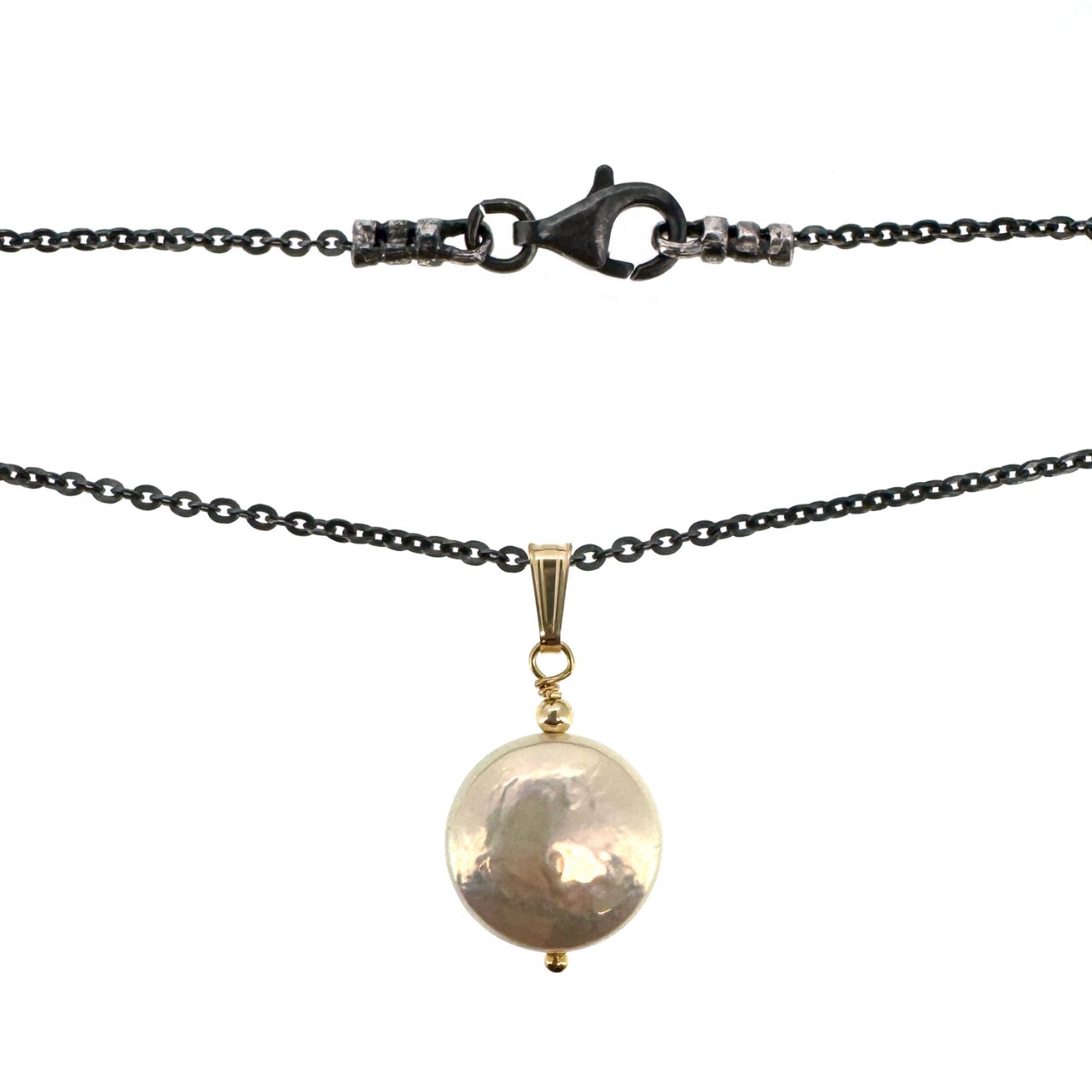 A Coin shaped white freshwater pearl dangles from a Gold Filled bail pendant on a delicate Dark Oxidized Sterling Silver cable chain