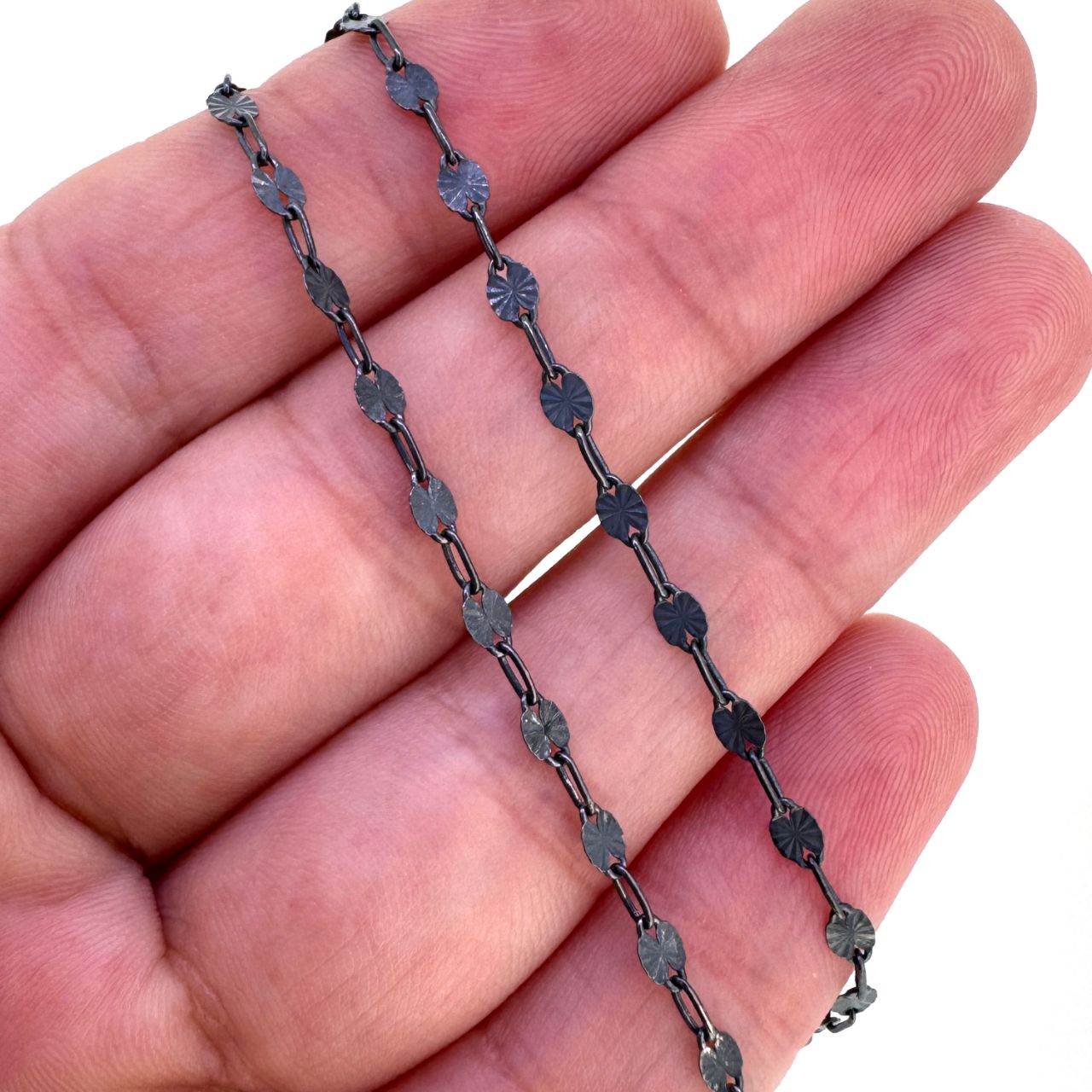 Add to compare list Oxidized 925 Sterling Silver Finished Jewlery Chain - Sunburst Paperclip Chain SKU : 601107OX Available Lengths: 7" - 36" Log In for Wholesale Prices