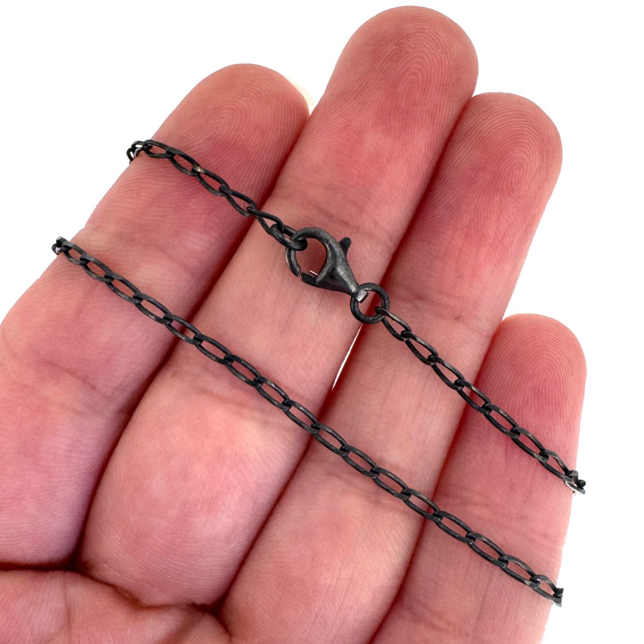 Add to compare list Oxidized Sterling Silver Finished Jewelry Chain - Solid Flat Oval Cable Chain SKU : 601029OX Lengths: 7" - 36", link is 1.7mm by 1.3mm Log In for Wholesale Prices