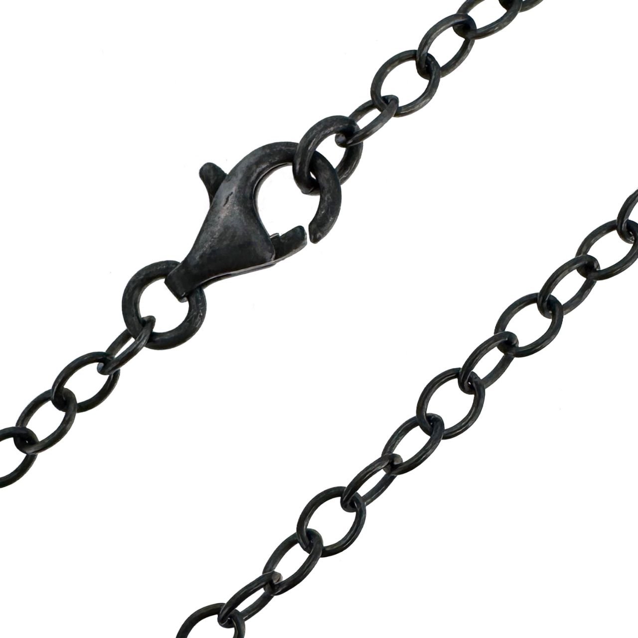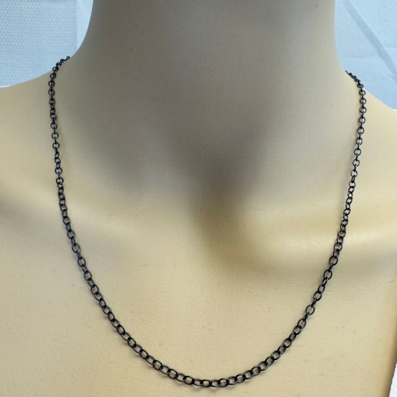 Add to compare list Oxidized Sterling Silver Bulk Chain - 2.5x3.5mm Oval Round Cable Chain (sold per foot) SKU : 101014-OX OD-3.5mm long by 2.5mm wide 10 links per inch Shiny Black Color Log In for Wholesale Prices
