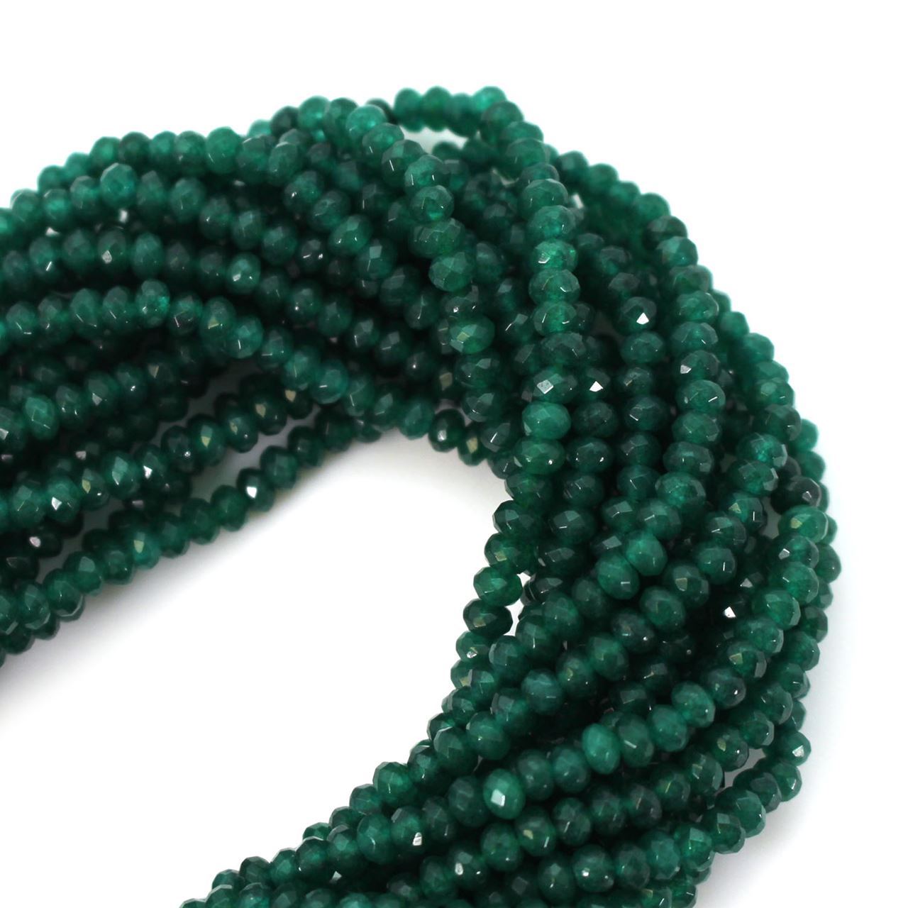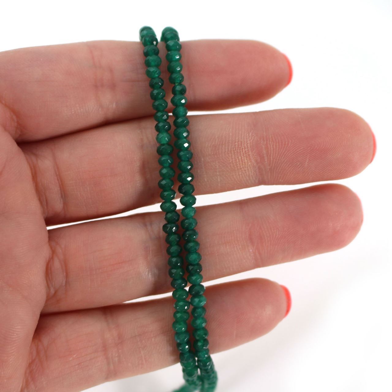 Gemstone Name: Green onyxShape: Faceted RondellSize: 3.5-4mm wide and about 2.5mm thicknessLength: 14 Inch StrandNumber of Beads: About 165 Beads