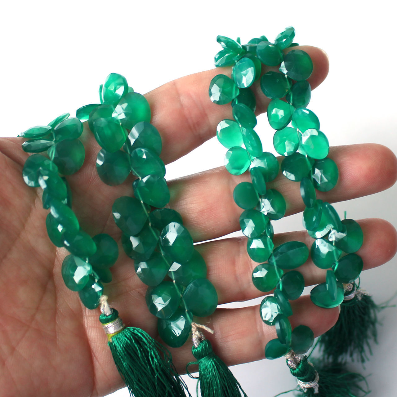 Quantity: one 9" strandStone: Green OnyxGrade: BMeasurement(L/W, thickness): GRADUATED SIZE 3-4mm thick (approximately)