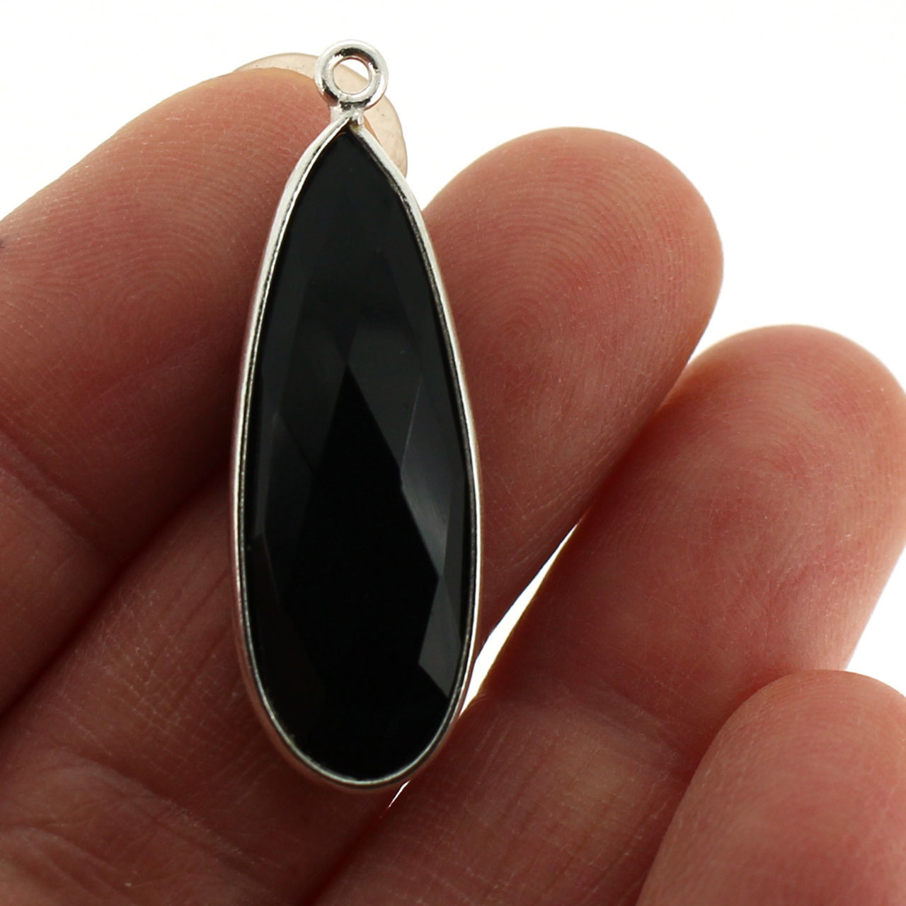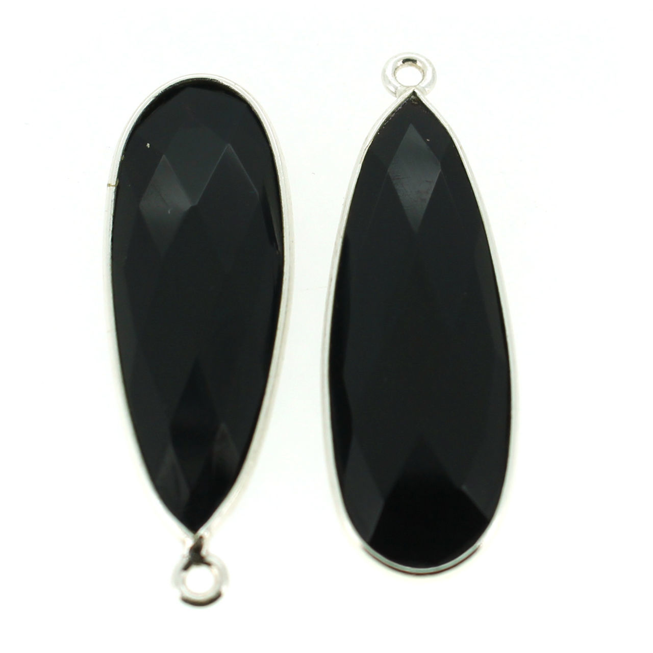 Stone: Black OnyxFrame Material: Solid Genuine .925 Sterling Silver. Shape: Elongated Faceted pear shape on both sides. Measurement: 34mm long 11mm wide, stone size is 30x10mm. Weight: Ave. 2.75 grams per piece.Quantity: 1 pc
