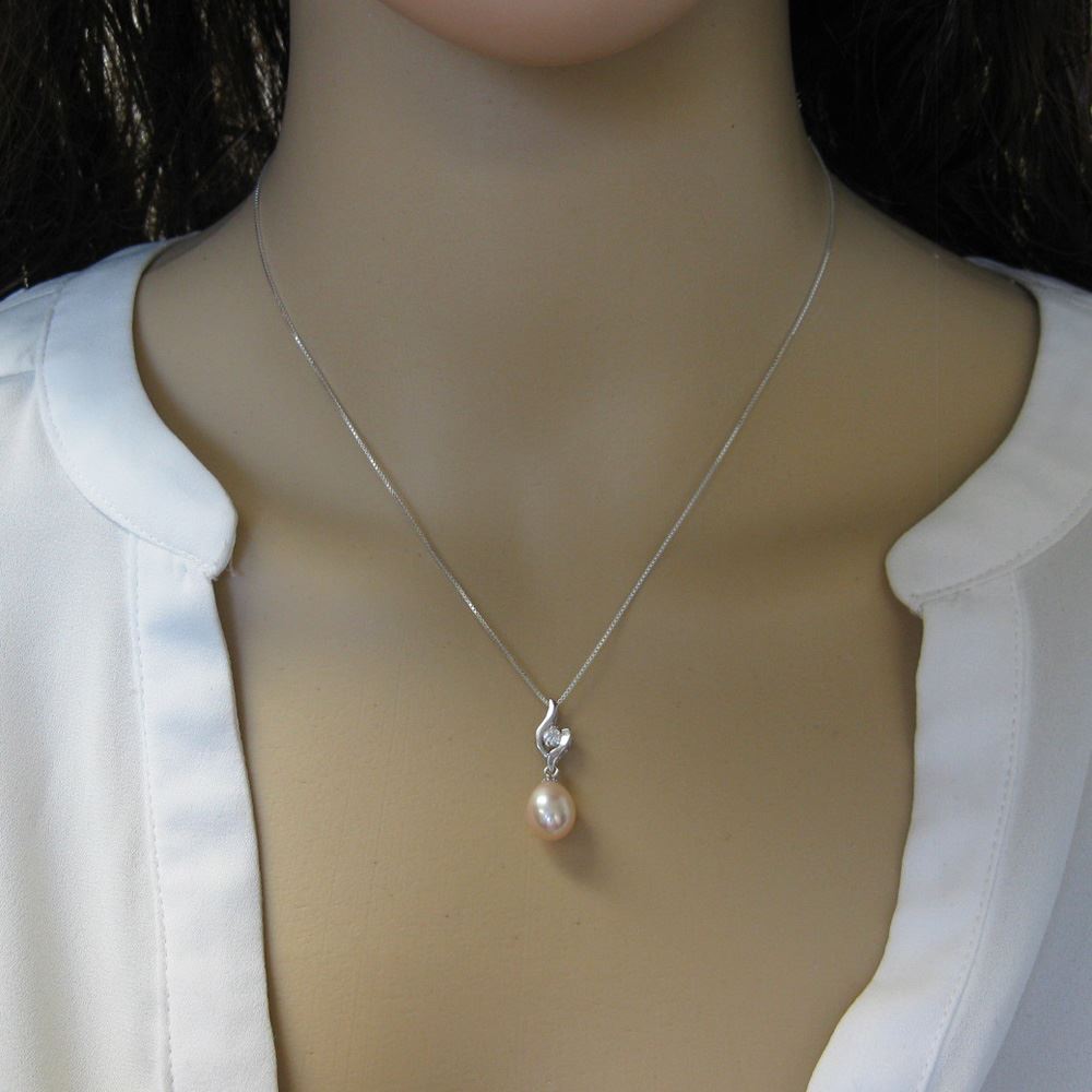 Add to compare list Sterling Silver Pink Freshwater Pearl and CZ Stone Swirl Pendant Necklace-16" SKU : AZ20017-PNK Pearl size: 8.5*10.5 Necklace Length: 16" Log In for Wholesale Prices