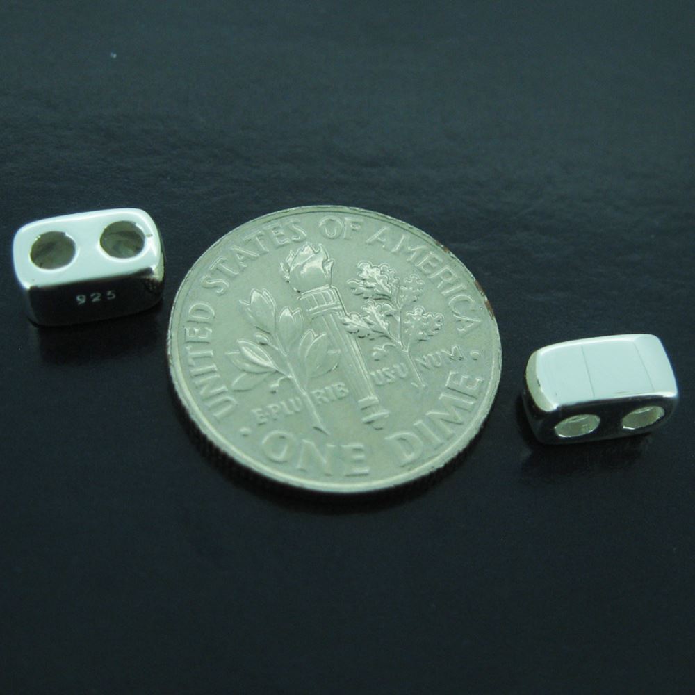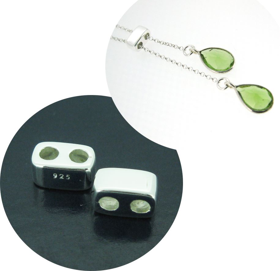 This sliding bead is great to make a lariat necklace without a clasp or any use as you can imagine! Easy to use!Material: solid 925 sterling silverStyle: Double hole stopper, sliding beads with siliconeSize: 8mm wide,4mm high and 4.5mm thickness, inner hole is 2mm, can fit 1.8mm chain Weight: 0.85 grams per pieceSKU: 211029