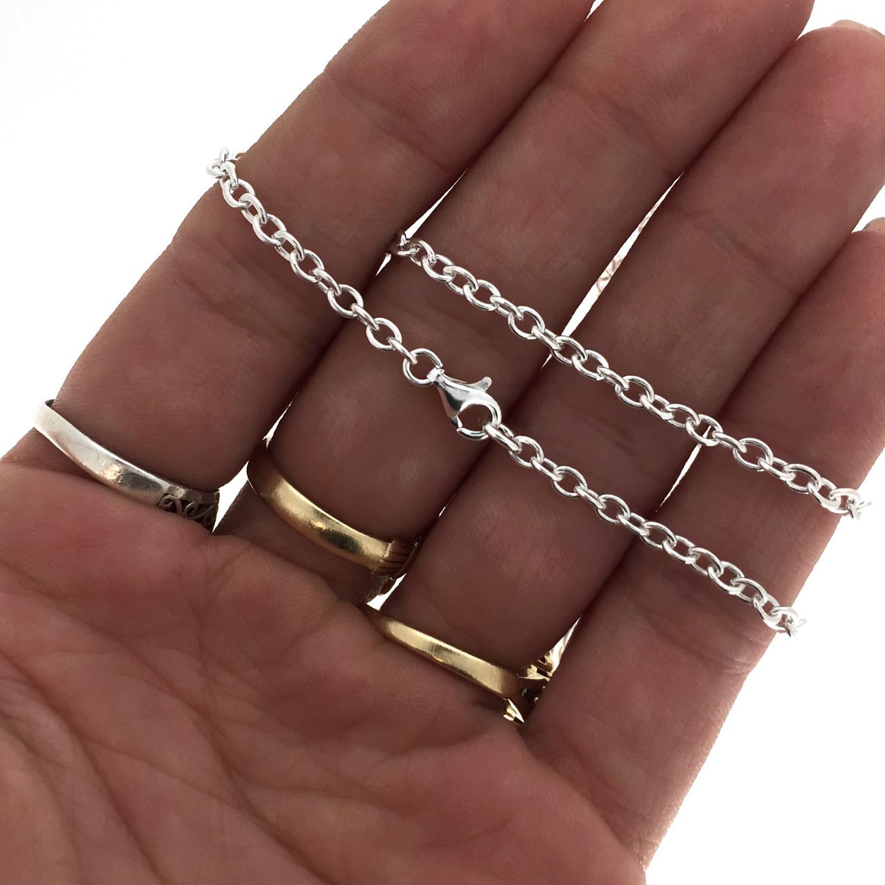 Best Seller Add to compare list Sterling Silver Bulk Chain - 1.5x2mm Small Flat Cable Chain (sold per foot) SKU : 101021 OD-2mm long by 1.5mm wide 17 links per inch Log In for Wholesale Prices