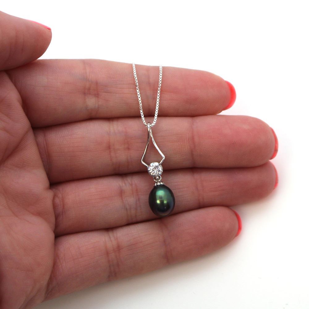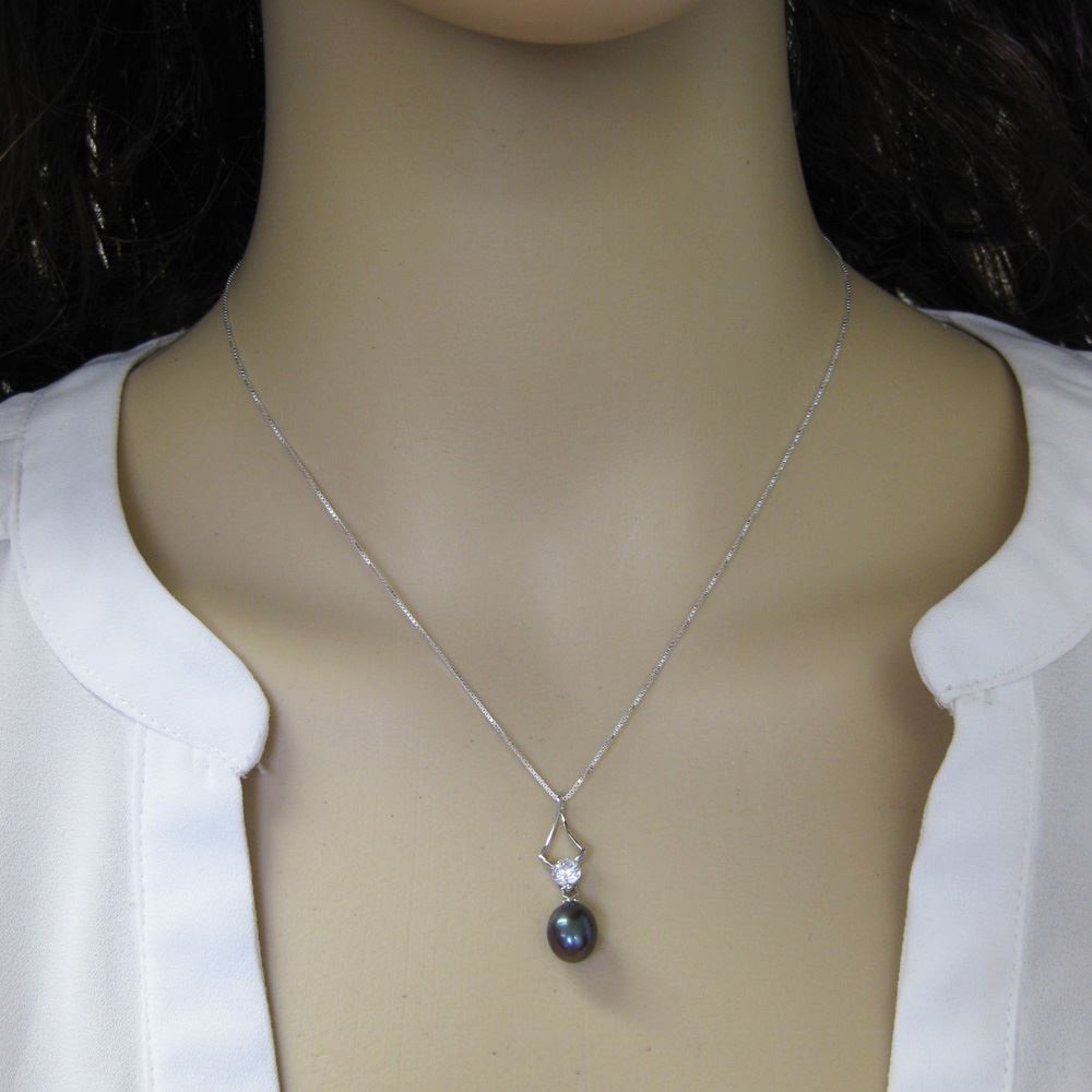 A peacock colored teardrop shaped freshwater pearl dangles below a sterling silver diamond shaped pendant with a 4mm cz stone. This necklace is the perfect accessory for any bridal party or the perfect birthday gift, especially for June birthdays.