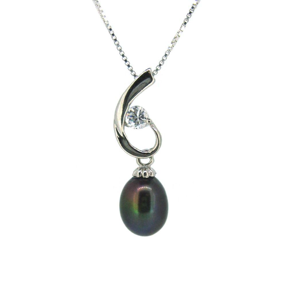 A peacock teardrop shaped freshwater pearl dangles below a sterling silver swirl pendant with a 3mm cz stone. This necklace is the perfect accessory for any bridal party or the perfect birthday gift, especially for June birthdays.