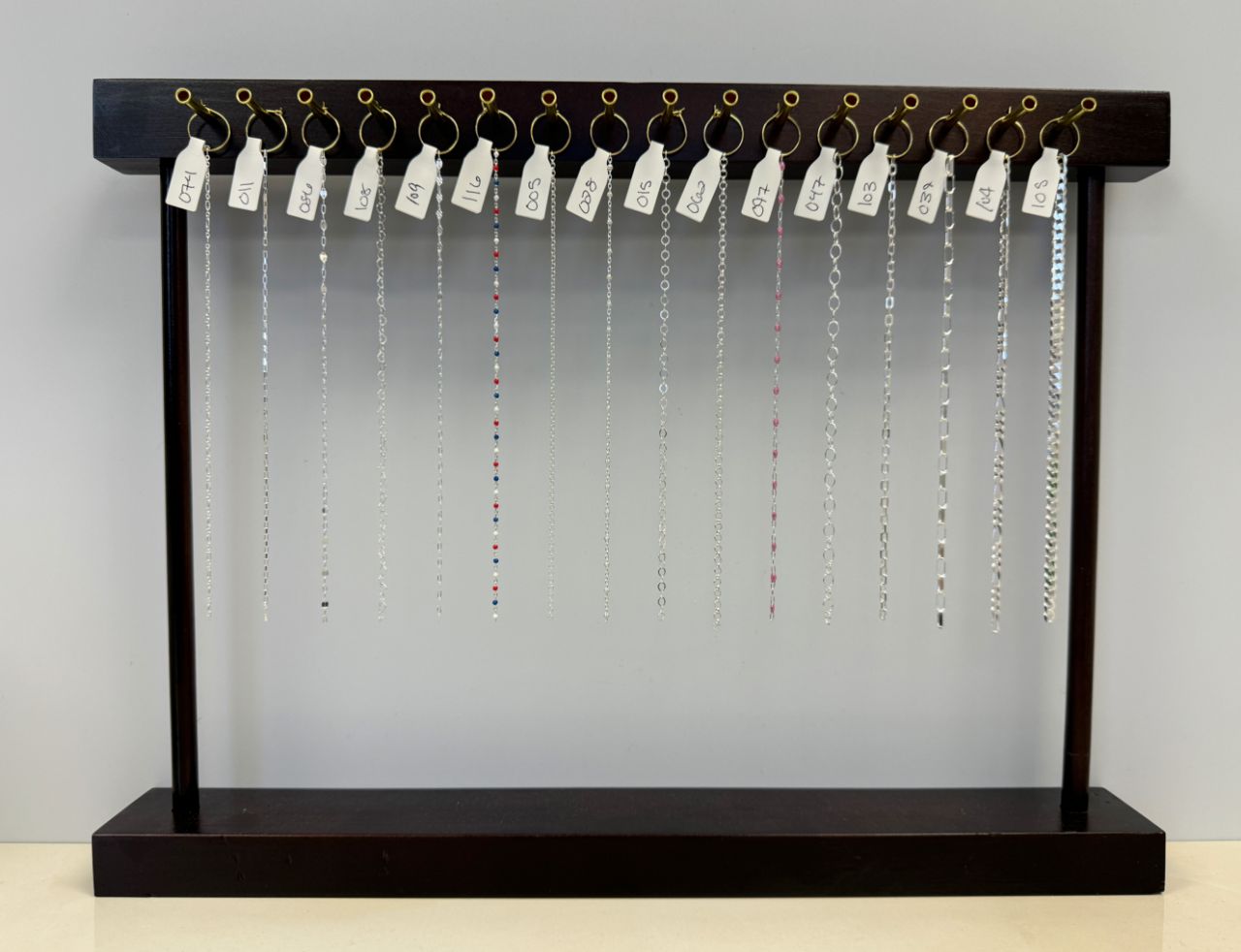 This kit comes with 16 chains of varrying styles and sizes. You also have the option of adding on a solid wood stand that includes 7 inches of each chain as samples!