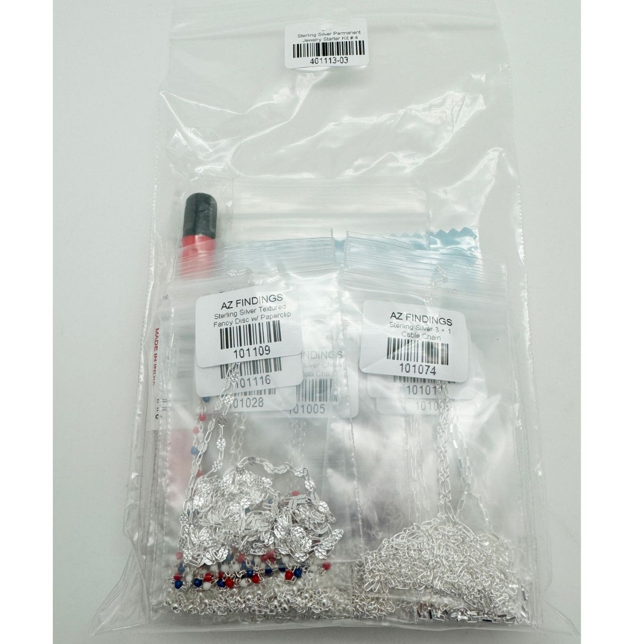3 feet kit (Total 48 feet chains-about 80 Bracelets),3 feet of each chain, 200 pcs of sterling silver Jumprings in different sizes,10 pcs of sterling silver clasps, 1 fiberglass scratch brush