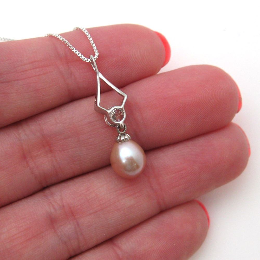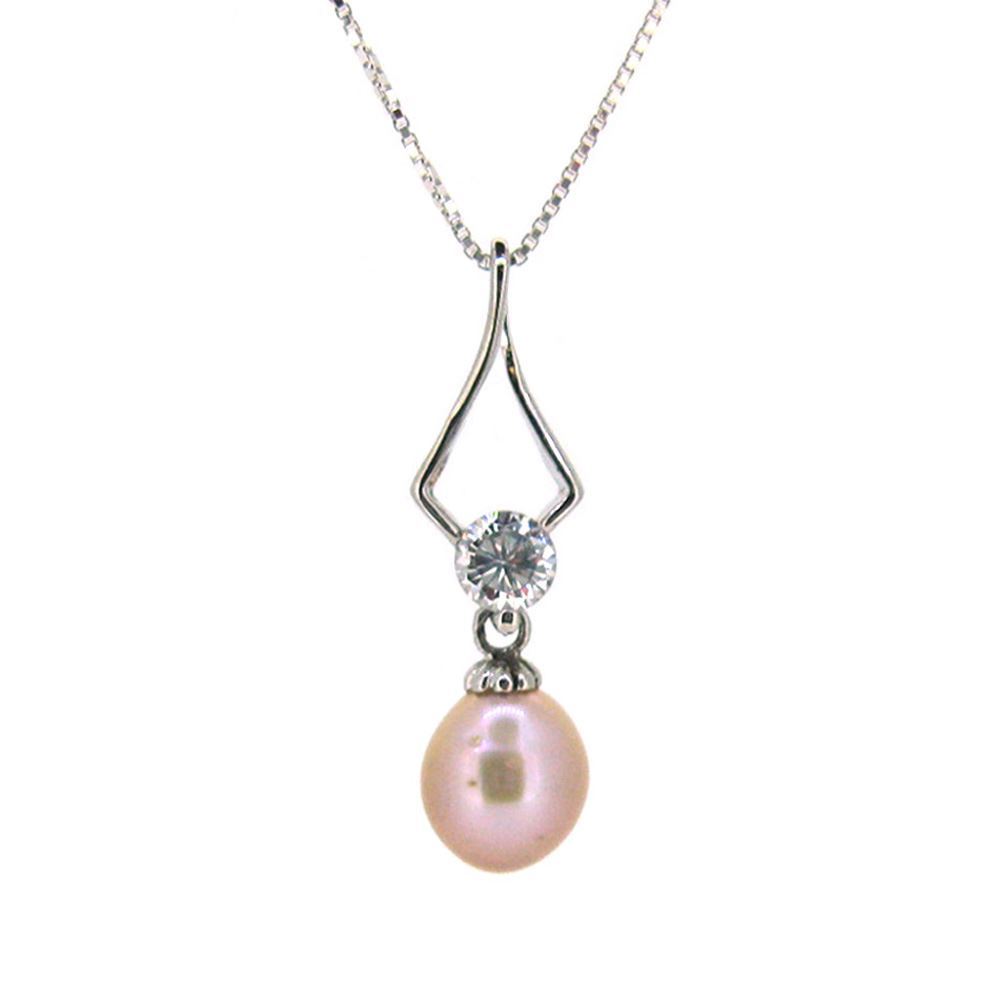 Add to compare list Sterling Silver Pink Freshwater Pearl and CZ Stone Swirl Pendant Necklace-16" SKU : AZ20017-PNK Pearl size: 8.5*10.5 Necklace Length: 16" Log In for Wholesale Prices