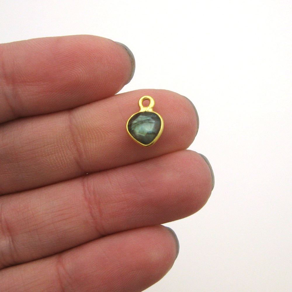 Stone: LabradoriteFrame Material: Gold Plated Solid Genuine .925 Sterling Silver. Shape: Tiny Faceted Heart Shape on both sides. Measurement: 10mm long, 7mm wide, stone size is 5.5x6mm. Weight: Ave. 0.3gmsQuantity: 1pc