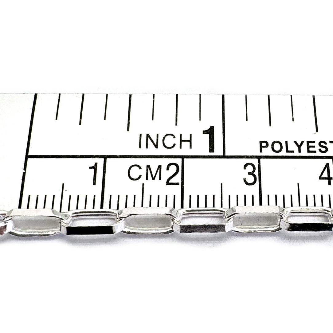 Best Seller Add to compare list Sterling Silver Bulk Chain - 1.5x3mm Small Long Box Chain (sold per foot) SKU : 101011 OD- 3mm long by 1.5mm wide 10.5 links per inch Log In for Wholesale Prices