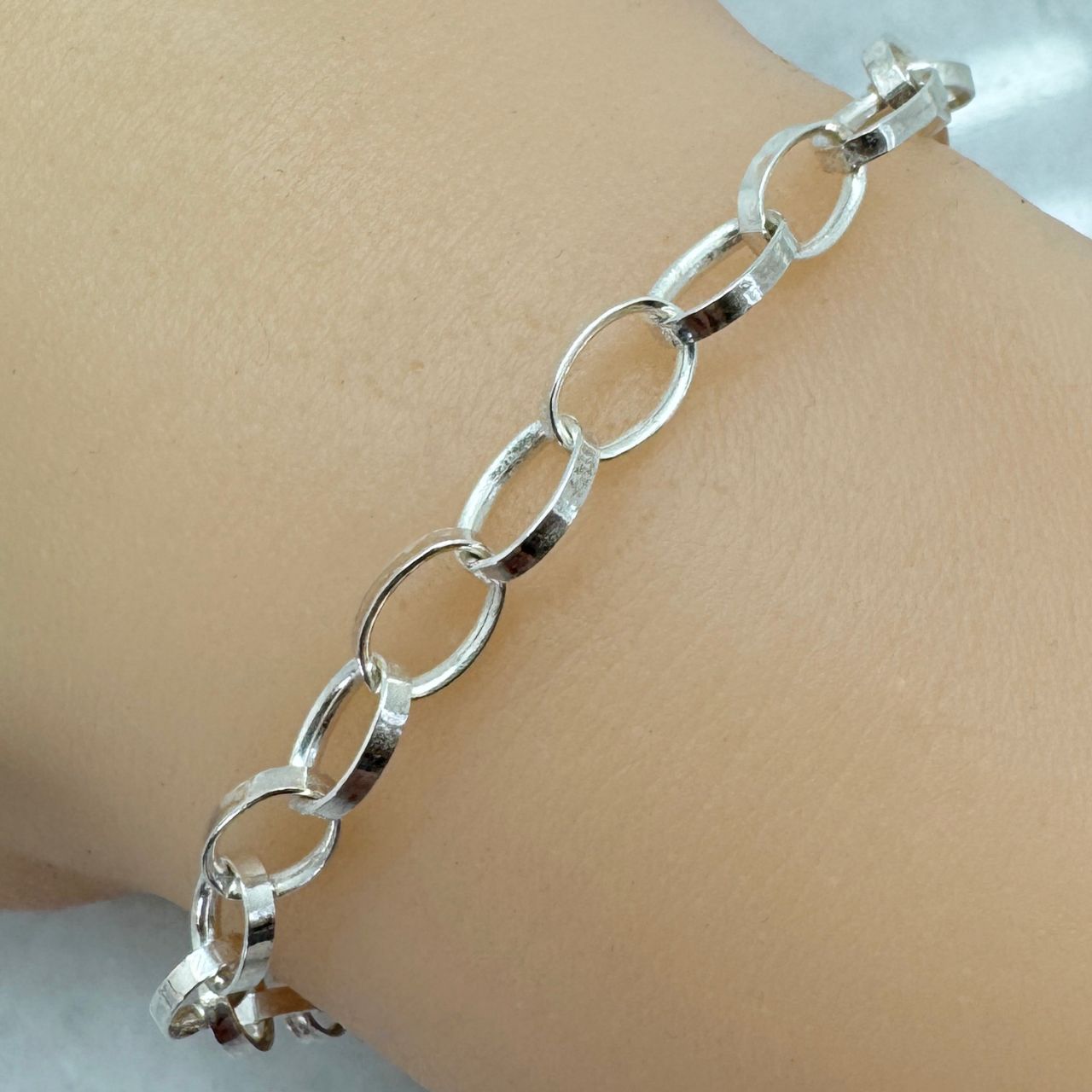 Add to compare list Sterling Silver Finished Chain - Chunky Flat Oval Rolo Chain SKU : 601004 Lengths: 7" - 36", link size is 5mm by 7.2mm. Perfect as a charm bracelet! Log In for Wholesale Prices