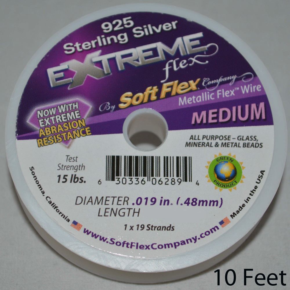 925 Sterling Silver Extreme Flex Wire by Soft FlexMaterial : Constructed of 19 micro woven metal alloy wires then coated in nylon, 925 Sterling silver plated. Size : .019 in , or .48mm . Ideal for small to medium beads in glass, metal etc. Will work with many pearls and seed beads as well.Test Strength : 15 lbs.Origin : USALength: 10 feet or 3.05 m spool.