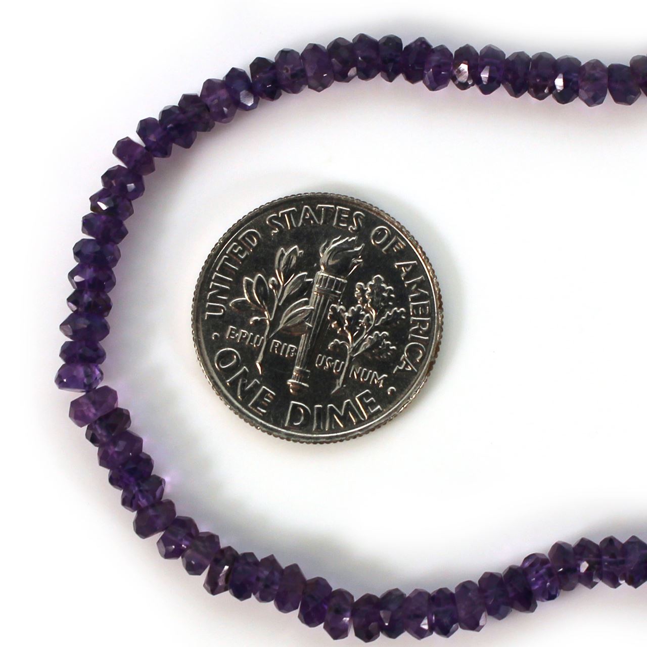 Gemstone Name: AmethystShape: Faceted RondellSize: 2.5-3mm wide and about 2mm thicknessLength: 13.5 Inches or 34 cm.Number of Beads: About 160 Beads