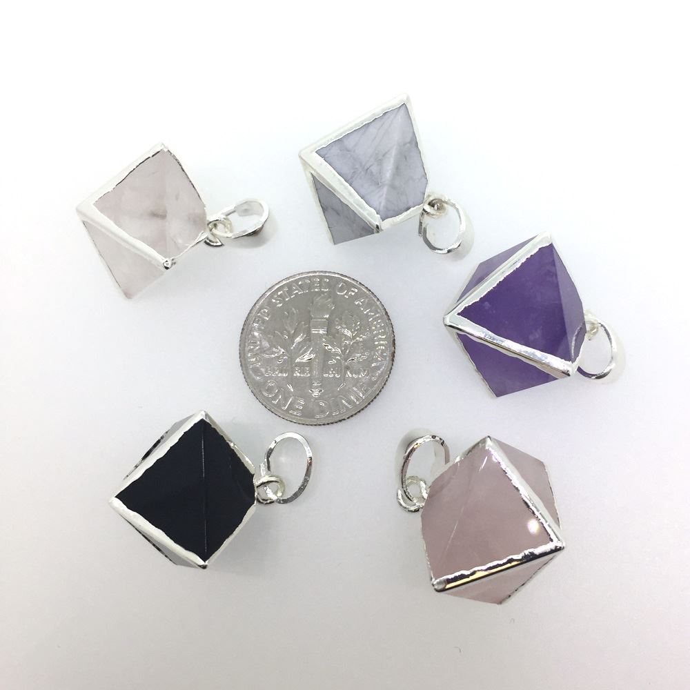 Stone: Assorted stonesType: PendantBail: Silver plated Brass bail, 8.5mmPendant Material: Natural gemstonesShape: OctahedronMeasurement: Approximately 25 long (including bail) by 14 x 19mm thick/wideWeight: 3-4 grams per piece.Quantity: 1 pendant