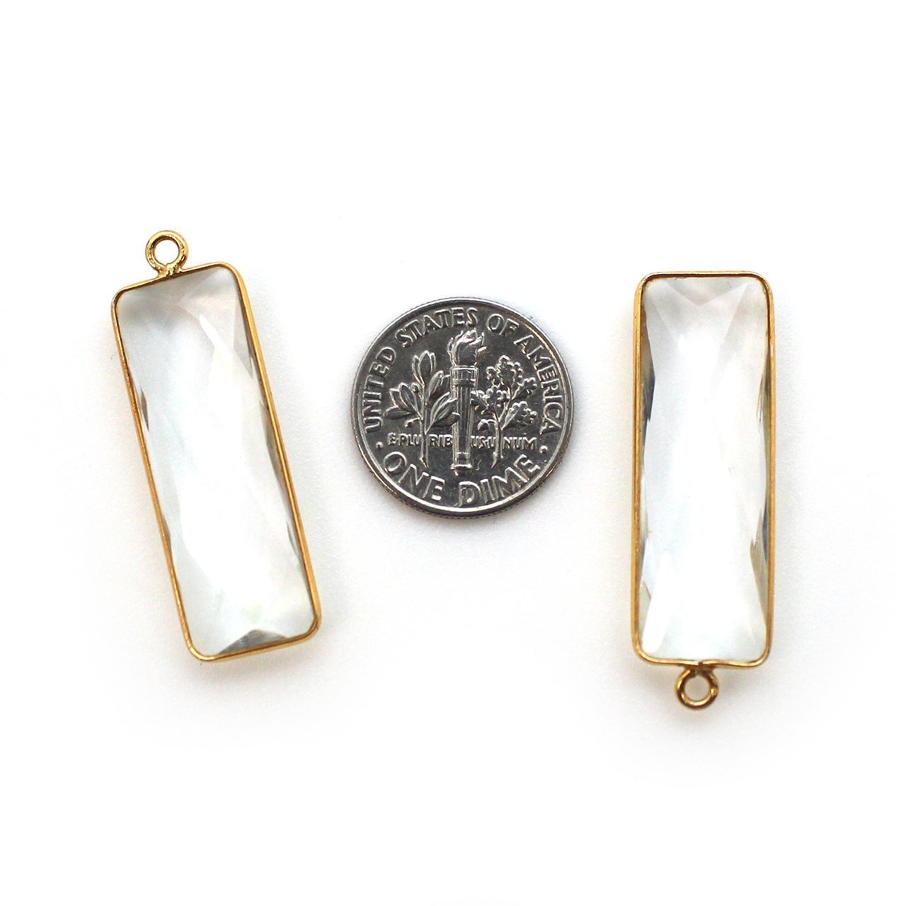 Stone: Crystal QuartzFrame Material: 22k gold over Solid Genuine .925 Sterling SilverShape: Faceted elongated rectangle shape on both sides. Measurement: 34mm long 11mm wide, stone size is 30x10mm. Weight: Ave. 3.3 grams per piece.Quantity: 1 pc
