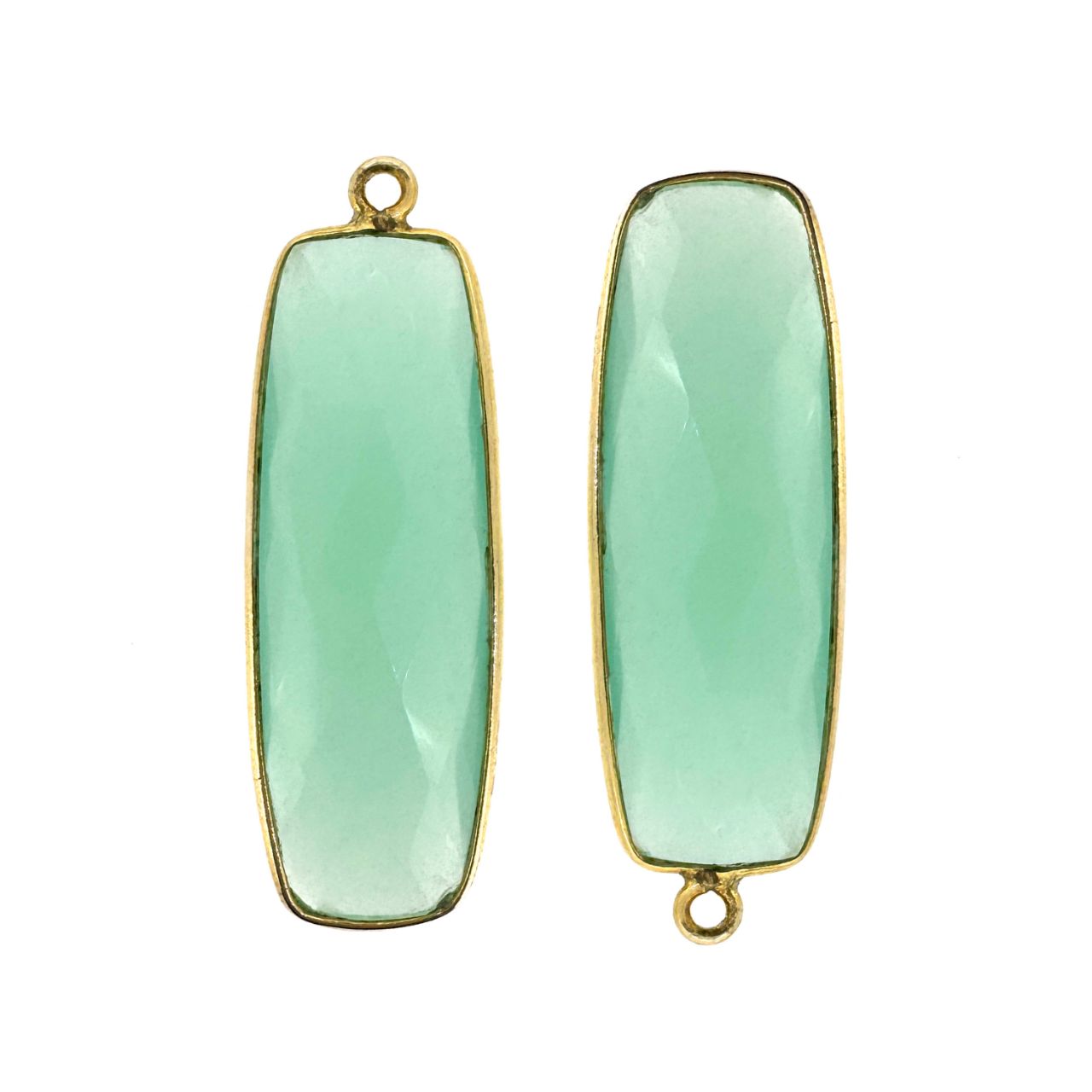 Stone: Peru ChalcedonyFrame Material: 22K gold over Solid Genuine .925 Sterling SilverShape: Faceted elongated rectangle shape on both sides. Measurement: 34mm long 11mm wide, stone size is 30x10mm. Weight: Ave. 3.3 grams per piece.Quantity: 1 pc