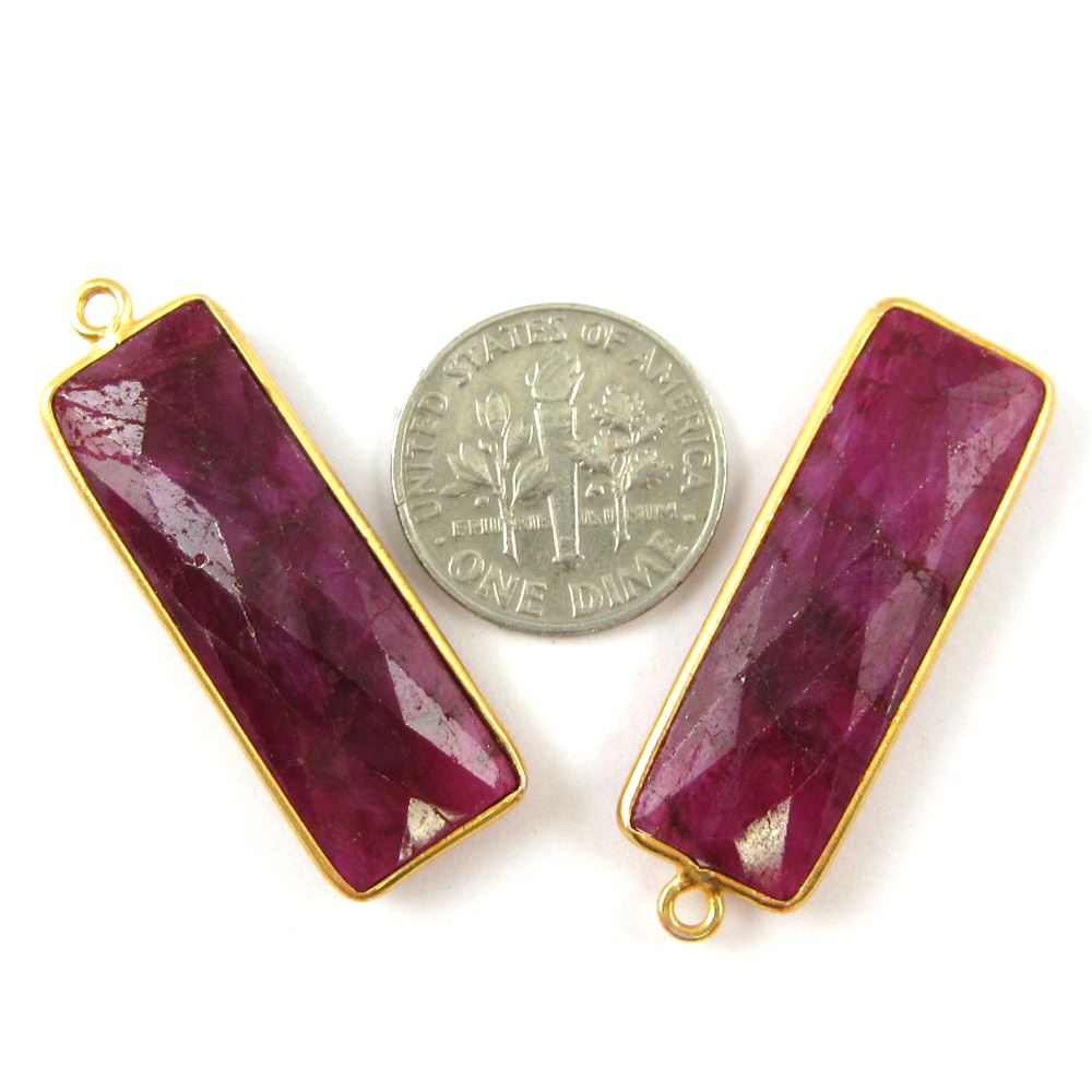 Stone: Ruby Dyed- Dyed RopadaFrame Material: Solid Genuine .925 Sterling Silver, 22k gold platedShape: Faceted elongated rectangle shape on both sides. Measurement: 34mm long 11mm wide, stone size is 30x10mm. Weight: Ave. 3.3 grams per piece.Quantity: 1 pc
