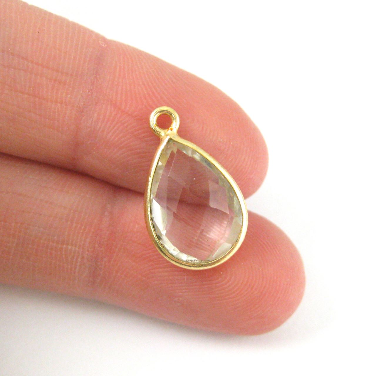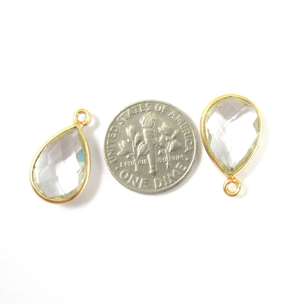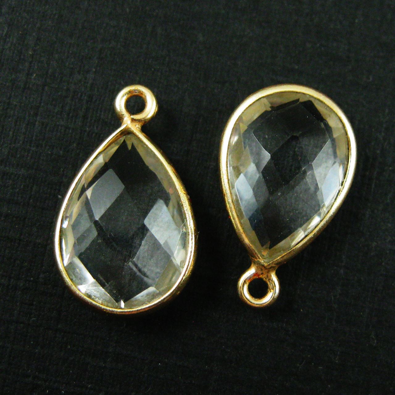 Stone: Crystal QuartzFrame Material: 22K Gold Over Solid Genuine .925 Sterling Silver. Shape: Faceted pear shape on both sides. Measurement: 18.5mm long 11.5mm wide, stone size is 10x14mm. Weight: 1.13 grams per pieceQuantity: 1 pc