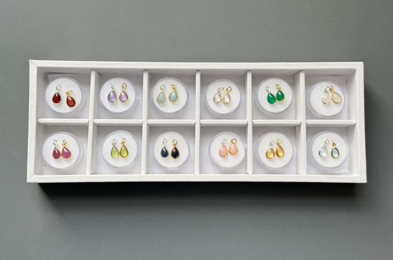 This kit includes all 12 birthstones in both Sterling Silver and Gold over Sterling Silver. Charm bar kit comes with dispaly tray as pictured.