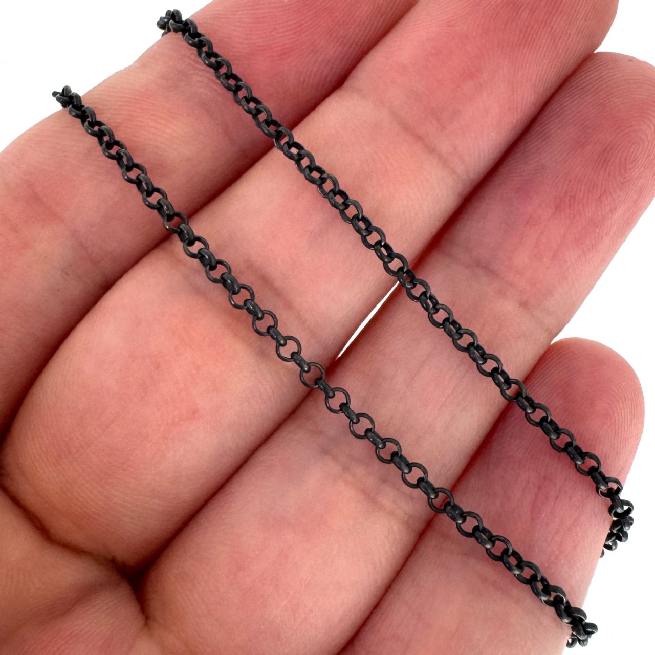 Add to compare list Oxidized Sterling Silver Finished Jewelry Chain - 2mm Rolo Chain SKU : 601005-OX Lengths: 16" - 36", 2mm rolo links Log In for Wholesale Prices