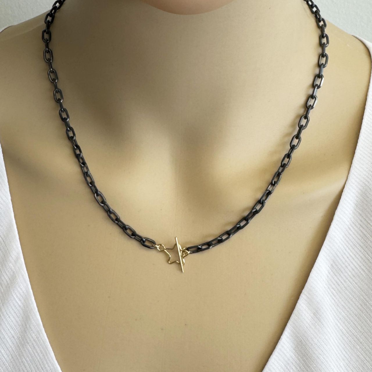 Add to compare list Oxidized 925 Sterling Silver Chunky Rolo Chain Necklace with 1/20 14K Gold Filled Round Toggle SKU : N0205X-GF Mixed Metal- Oxidized 925 Sterling Silver and 1/20 14K Gold Filled. 18" in Length. Log In for Wholesale Prices