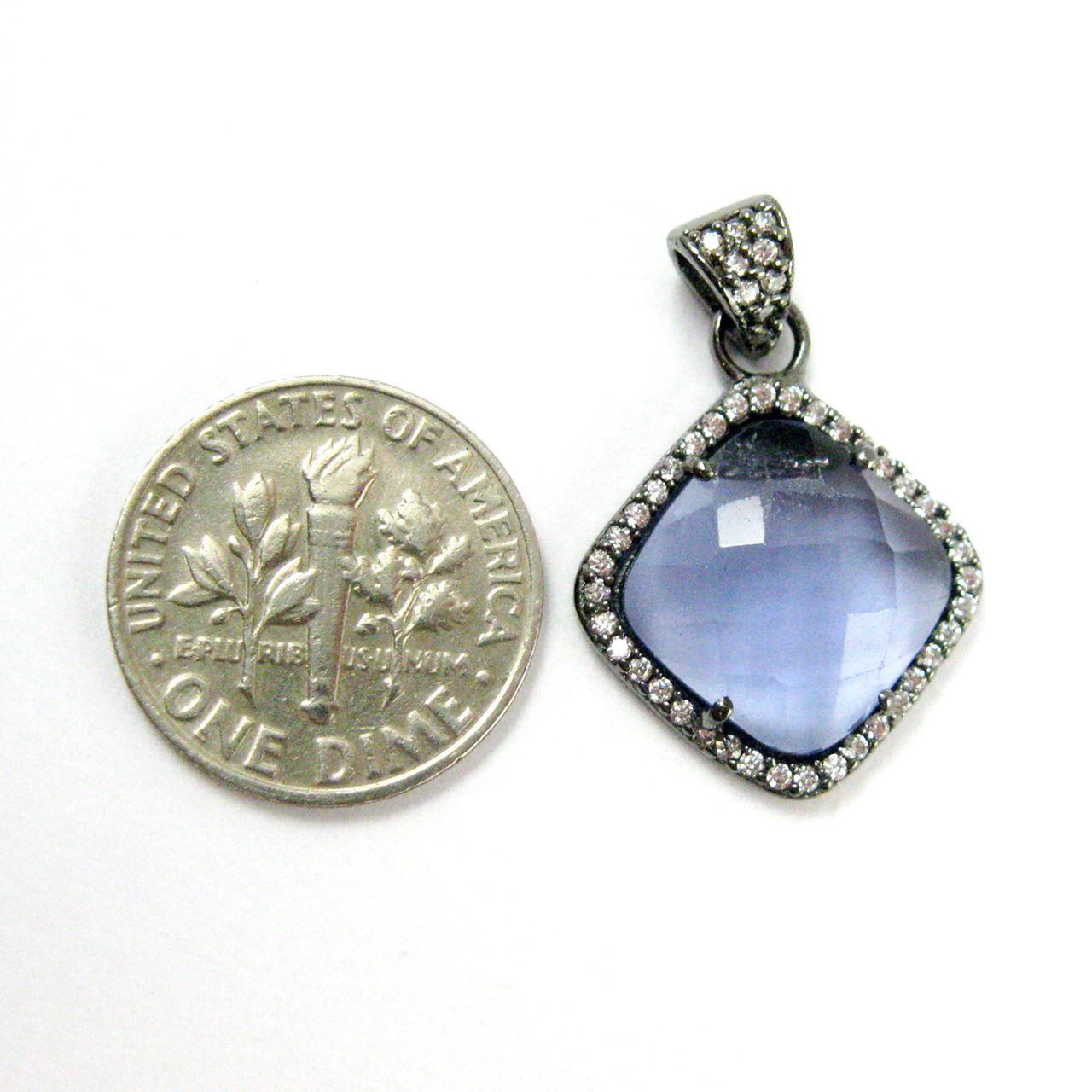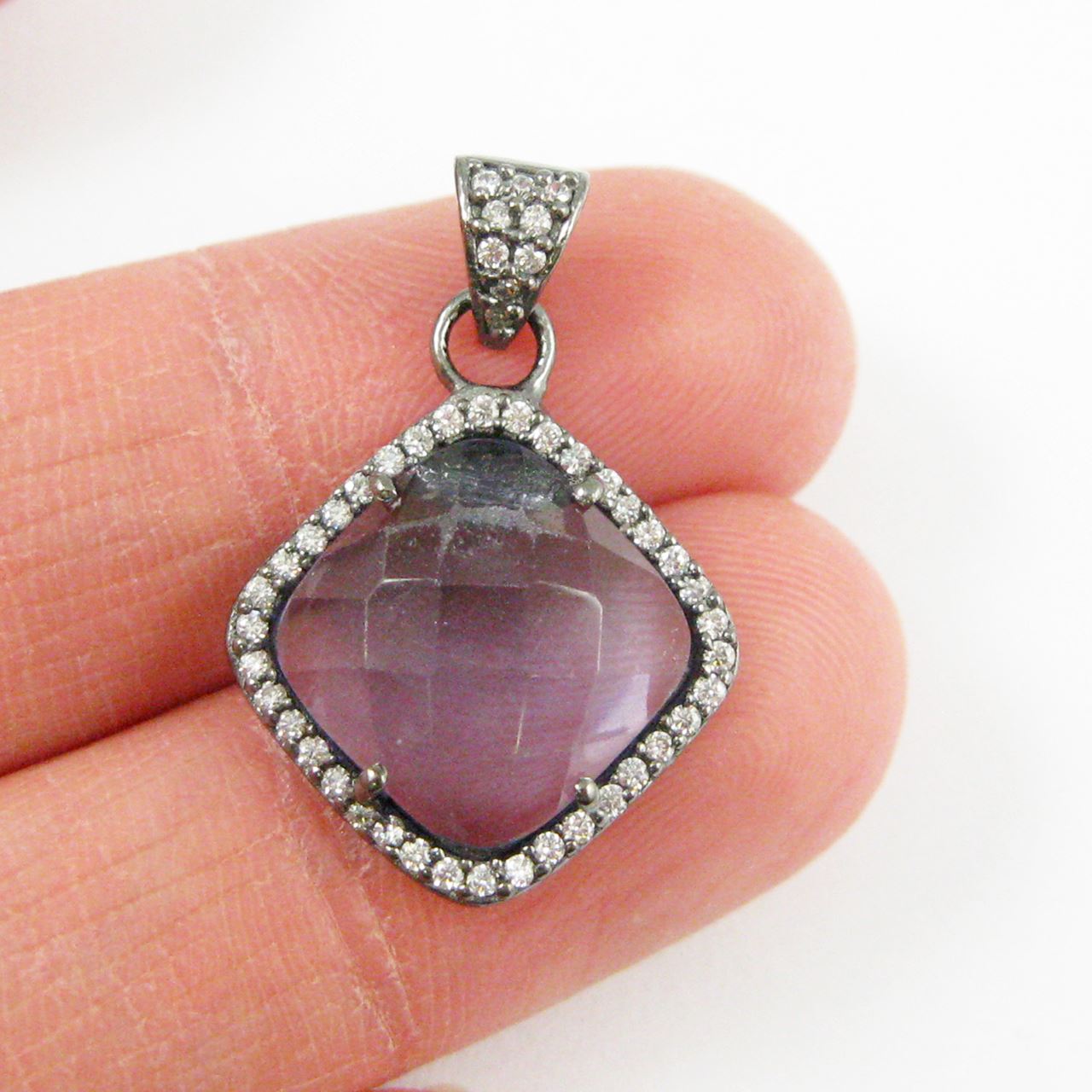 Stone: Iolite QuartzBail and Frame Material: Oxidized Solid Genuine .925 Sterling Silver with Cubic Zirconia CZ Pave stone settingBail: 2.5mm inner diameter, 7mm longShape: Diamond Shape, flat back925: 925 stamp on backMeasurement: 17.5mm wide by 21.5 mm long, 26 mm long with bail, 5 mm thickWeight: 2.4-2.8 grams per piece.Quantity: 1 piece
