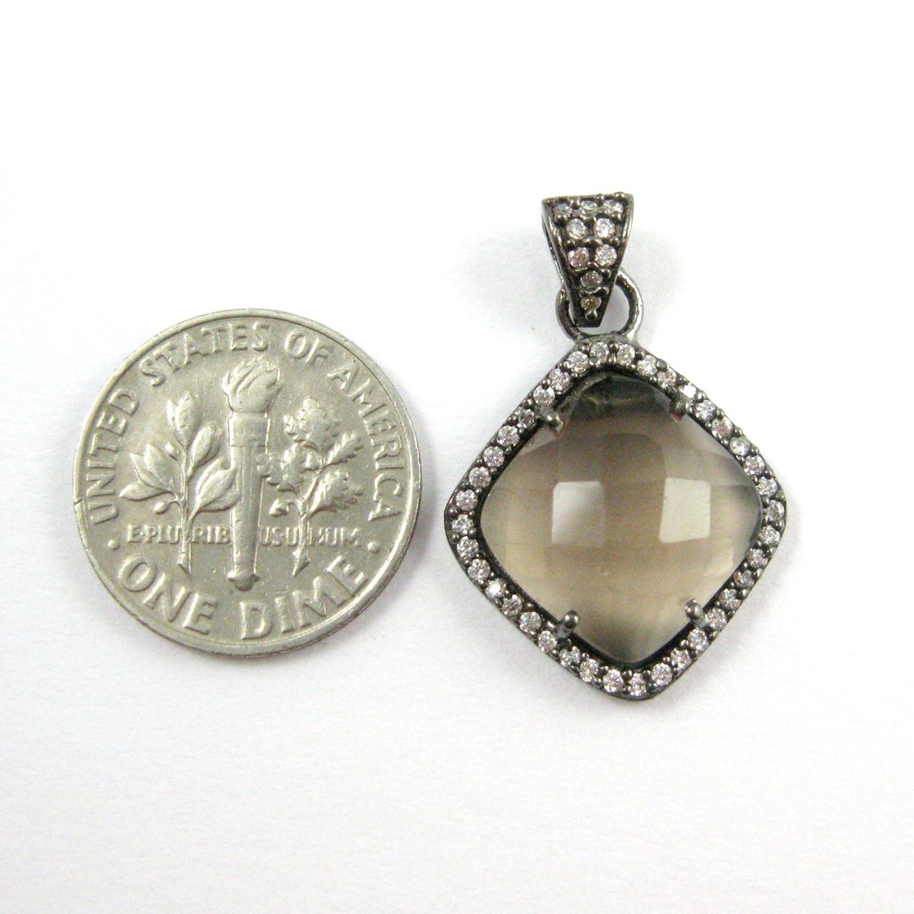 Stone: Smoky QuartzBail and Frame Material: Oxidized Solid Genuine .925 Sterling Silver with Cubic Zirconia CZ Pave stone settingBail: 2.5mm inner diameter, 7mm longShape: Diamond Shape, flat back925: 925 stamp on backMeasurement: 17.5mm wide by 21.5 mm long, 26 mm long with bail, 5 mm thickWeight: 2.4-2.8 grams per piece.Quantity: 1 piece