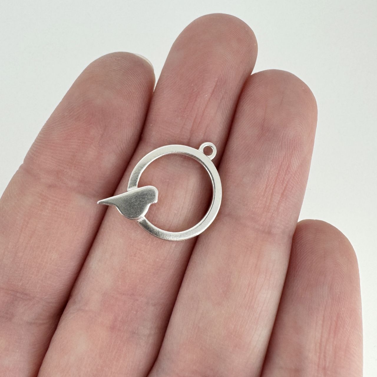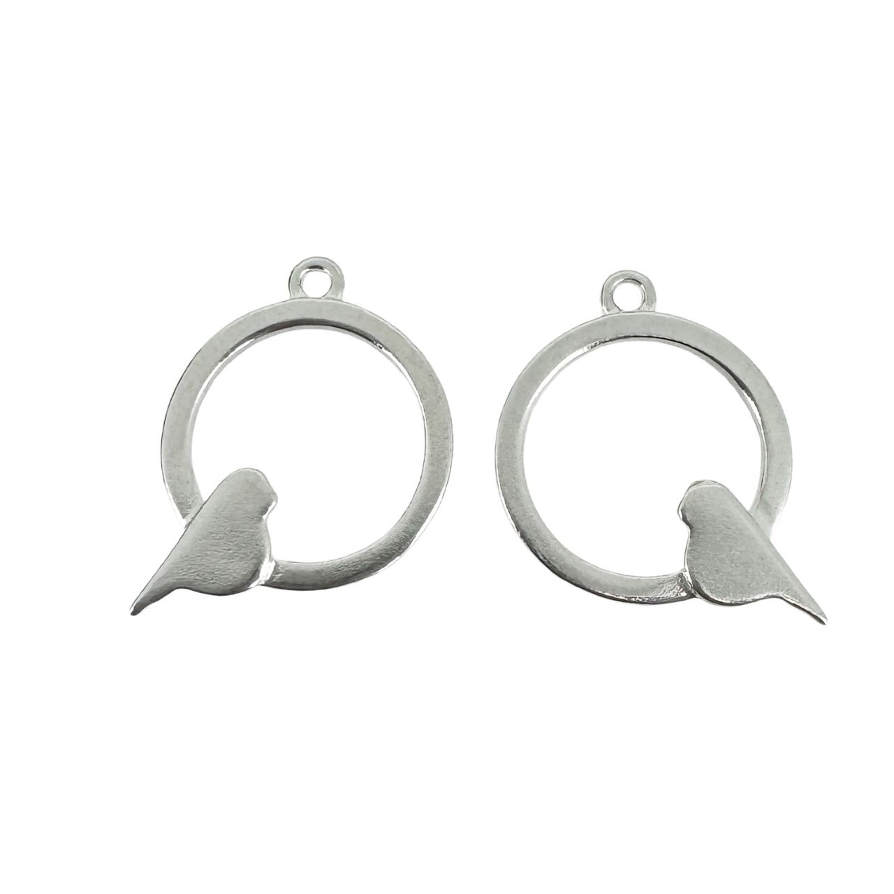 Material: Solid Genuine .925 Sterling Silver. Shape: Circle charm with a bird perched on the lower corner. One bird on the right side, one bird on the left, perfect for earrings to match our bird family bar connector necklaces.Measurement: Circle is 15mm around, Total length including top ring to bottom of bird is 20mm, 1.2mm thick, top ring suitable with 18 gauge (1 mm) or smaller. Bird is 10mm longWeight: 1.14 grams per piece.Quantity: Sold per 2 pieces, birds on opposite sides, not identicalSKU: 201238