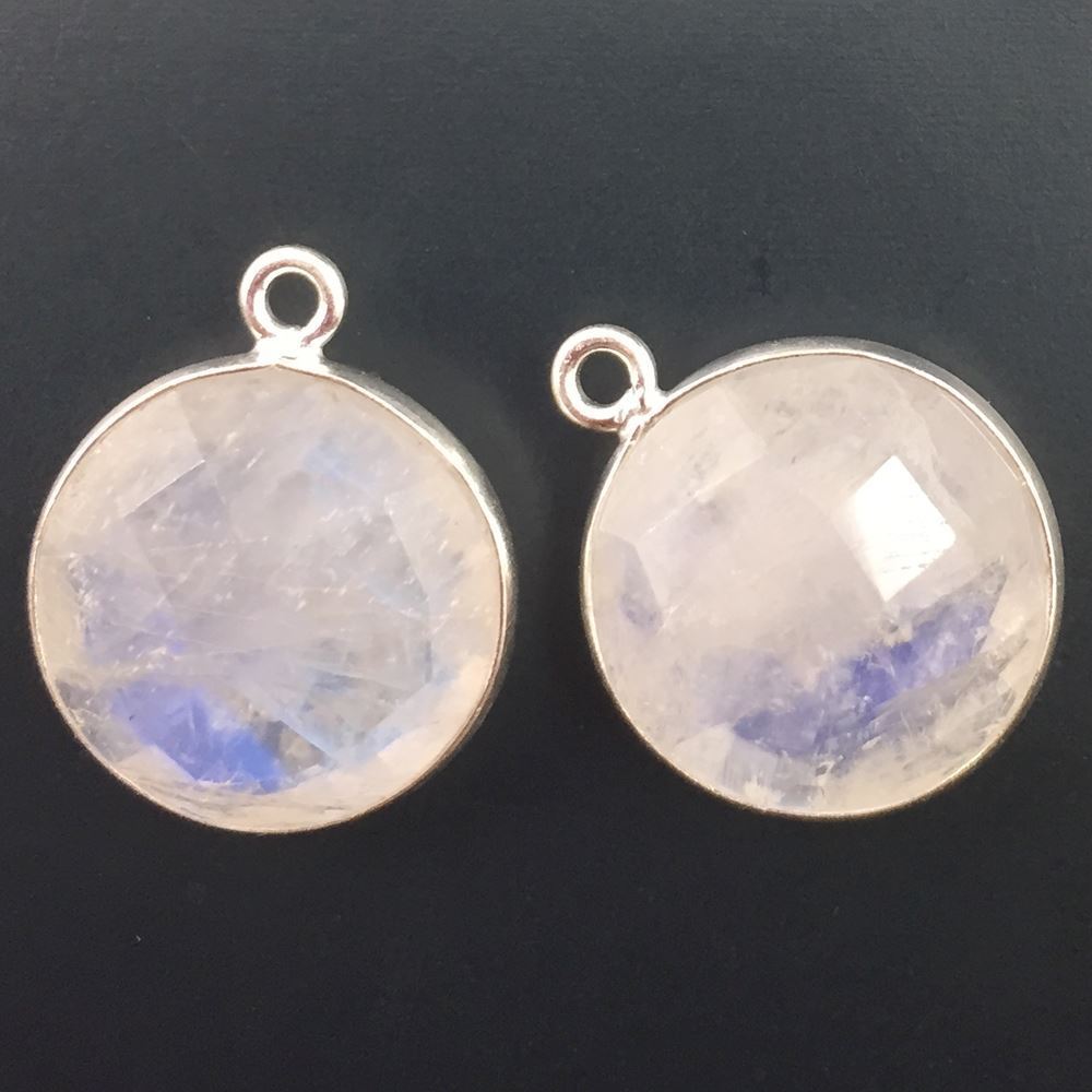 Gemstone: MoonstoneFrame Material: Genuine .925 Sterling Silver. Shape: Faceted coin shape on both sides. Measurement: 19mm long, stone is 14mm. Weight: 1.8 grams per piece.